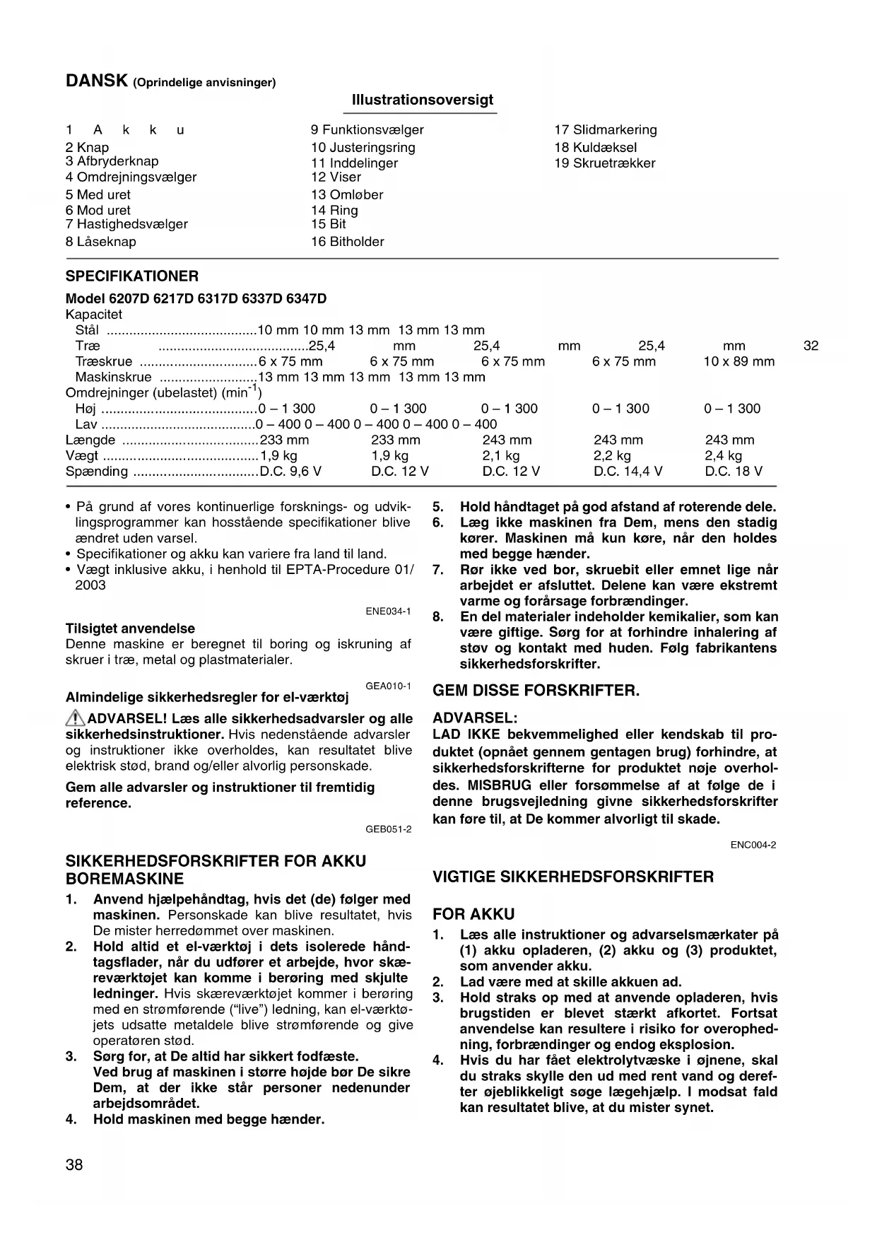 være giftige. Sørg for at forhindre inhalering af støv og kontakt med huden. Følg fabrikantens sikkerhedsforskrifter. GEM DISSE FORSKRIFTER. ADVARSEL: LAD IKKE bekvemmelighed eller kendskab til pro- duktet (opnået gennem gentagen brug) forhindre, at sikkerhedsforskrifterne for produktet nøje overhol- des. MISBRUG eller forsømmelse af at følge de i denne brugsvejledning givne sikkerhedsforskrifter kan føre til, at De kommer alvorligt til skade. ENC004-2 VIGTIGE SIKKERHEDSFORSKRIFTER FOR AKKU