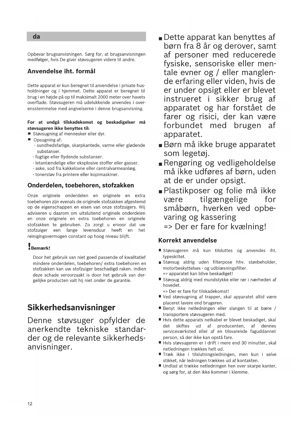 Opbevar brugsanvisningen. Sørg for, at brugsanvisningen medfølger, hvis De giver støvsugeren videre til andre. Anvendelse iht. formål Dette apparat er kun beregnet til anvendelse i private hus- holdninger og i hjemmet. Dette apparat er beregnet til brug i en højde på op til maksimalt 2000 meter over havets overflade. Støvsugeren må udelukkende anvendes i over- ensstemmelse med angivelserne i denne brugsanvisning. For at undgå tilskadekomst og beskadigelser må støvsugeren ikke benyttes til: Støvsugning af mennesker eller dyr. Opsugning af: - sundhedsfarlige, skarpkantede, varme eller glødende substanser. - fugtige eller flydende substanser. - letantændelige eller eksplosive stoffer eller gasser. - aske, sod fra kakkelovne eller centralvarmeanlæg. - tonerstøv fra printere eller kopimaskiner. Onderdelen, toebehoren, stofzakken Onze originele onderdelen en originele en extra toebehoren zijn evenals de originele stofzakken afgestemd op de eigenschappen en eisen van onze stofzuigers. Wij adviseren u daarom om uitsluitend originele onderdelen en onze originele en extra toebehoren en originele stofzakken te gebruiken. Zo zorgt u ervoor dat uw stofzuiger een lange levensduur heeft en het reinigingsvermogen constant op hoog niveau blijft. !Bemærk! Door het gebruik van niet goed passende of kwalitatief mindere onderdelen, toebehoren/ extra toebehoren en stofzakken kan uw stofzuiger beschadigd raken. Indien deze schade veroorzaakt is door het gebruik van der- gelijke producten valt hij niet onder de garantie. Sikkerhedsanvisninger Denne støvsuger opfylder de anerkendte tekniske standar- der og de relevante sikkerheds- anvisninger. Dette apparat kan benyttes af børn fra 8 år og derover, samt af personer med reducerede fysiske, sensoriske eller men- tale evner og / eller manglen- de erfaring eller viden, hvis de er under opsigt eller er blevet instrueret i sikker brug af apparatet og har forstået de farer og risici, der kan være forbundet med brugen af apparatet. Børn må ikke bruge apparatet som legetøj. Rengøring og vedligeholdelse må ikke udføres af børn, uden at de er under opsigt. Plastikposer og folie må ikke være tilgængelige for småbørn, hverken ved opbe- varing og kassering => Der er fare for kvælning! Korrekt anvendelse Støvsugeren må kun tilsluttes og anvendes iht. typeskiltet. Støvsug aldrig uden filterpose hhv. støvbeholder, motorbeskyttelses - og udblæsningsfilter. => apparatet kan blive beskadiget! Støvsug aldrig med mundstykke eller rør i nærheden af hovedet. => Der er fare for tilskadekomst! Ved støvsugning af trapper, skal apparatet altid være placeret lavere end brugeren. Benyt ikke netledningen eller slangen til at bære / transportere støvsugeren med. Hvis dette apparats netkabel er blevet beskadiget, skal det skiftes ud af producenten, af dennes serviceværksted eller af en tilsvarende faguddannet person, så der ikke kan opstå fare. Hvis støvsugeren er i drift i mere end 30 minutter, skal netledningen trækkes helt ud. Træk ikke i tilslutningsledningen, men kun i selve stikket, når ledningen trækkes ud af kontakten. Undlad at trække netledningen hen over skarpe kanter, og sørg for, at den ikke kommer i klemme.13 Pas på, at netstikket ikke rammer personer, legemsdele, husdyr eller genstande under den automatiske ledningsoprulning. => Hold i stikket og ikke i selve ledningen, når netledningen trækkes ud. Træk altid netstikket ud af kontakten, inden der foretages nogen form for arbejde på støvsugeren. Støvsugeren må ikke anvendes, hvis den er beskadiget. Træk netstikket ud af kontakten i tilfælde af en funktionsfejl ved apparatet. For at der ikke skal opstå fare, må reparationer af støvsugeren og udskiftning af reservedele kun udføres af et autoriseret serviceværksted. Støvsugeren skal beskyttes mod fugt, vejr og vind samt påvirkning fra varmekilder. Hæld ikke brændbare eller alkoholholdige substanser på filtrene (filterpose, motorbeskyttelsesfilter, udblæsningsfilter etc.). Støvsugeren er ikke beregnet til anvendelse på byggepladser. => Opsugning af byggeaffald kan beskadige apparatet. Sluk for apparatet, og træk netstikket ud, når der ikke støvsuges. Et kasseret apparat skal gøres ubrugeligt med det samme og herefter bortskaffes efter forskrifterne. !Bemærk! Hvis sikringen springer, når støvsugeren tændes, kan årsagen til dette være, at der er tilsluttet flere elapparater med stort effektforbrug samtidig i den samme strømkreds. For at undgå at sikringen udløses, skal støvsugeren indstilles til det laveste effekttrin, inden der tændes for den, og først derefter skal der vælges et højere effekttrin. Anvisninger om bortskaffelse Emballage Emballagen beskytter støvsugeren mod beskadigelse under transport. Den består af miljøvenlige materialer og kan derfor genbruges. Emballage, der ikke skal anvendes mere, bør bortskaffes på genbrugsstationer eller lignende. Kasserede støvsugere Kasserede apparater indeholder materialer, der kan genbruges. Aflever derfor kasserede støvsugere hos forhandleren eller i et genbrugscenter. Der kan indhentes oplysninger om gældende bortskaffelsesregler hos forhandleren eller på kommunen. Bortskaffelse af filtre og filterposer Filtre og filterposer er fremstillet af miljøvenlige materialer. Hvis de ikke indeholder substanser, som ikke må lægges i normalt husholdningsaffald, kan de bortskaffes som normalt husholdningsaffald. Oplysninger om energimærket Denne støvsuger er en universalstøvsuger med primær slange. For at opnå den bedste energieffektivitet og rengøringsklasse på tæpper skal universalmundstykket anvendes. For at opnå den deklarerede energieffektivitet og rengøringsklasse på hårde gulve med fuger og sprækker skal det medfølgende mundstykke til hårde gulvbelægninger anvendes uden den påklipsbare børstering. Beregningerne er baseret på Kommissionens delegerede forordning (EU) nr. 665/2013 af 3. maj 2013 som supplement til direk