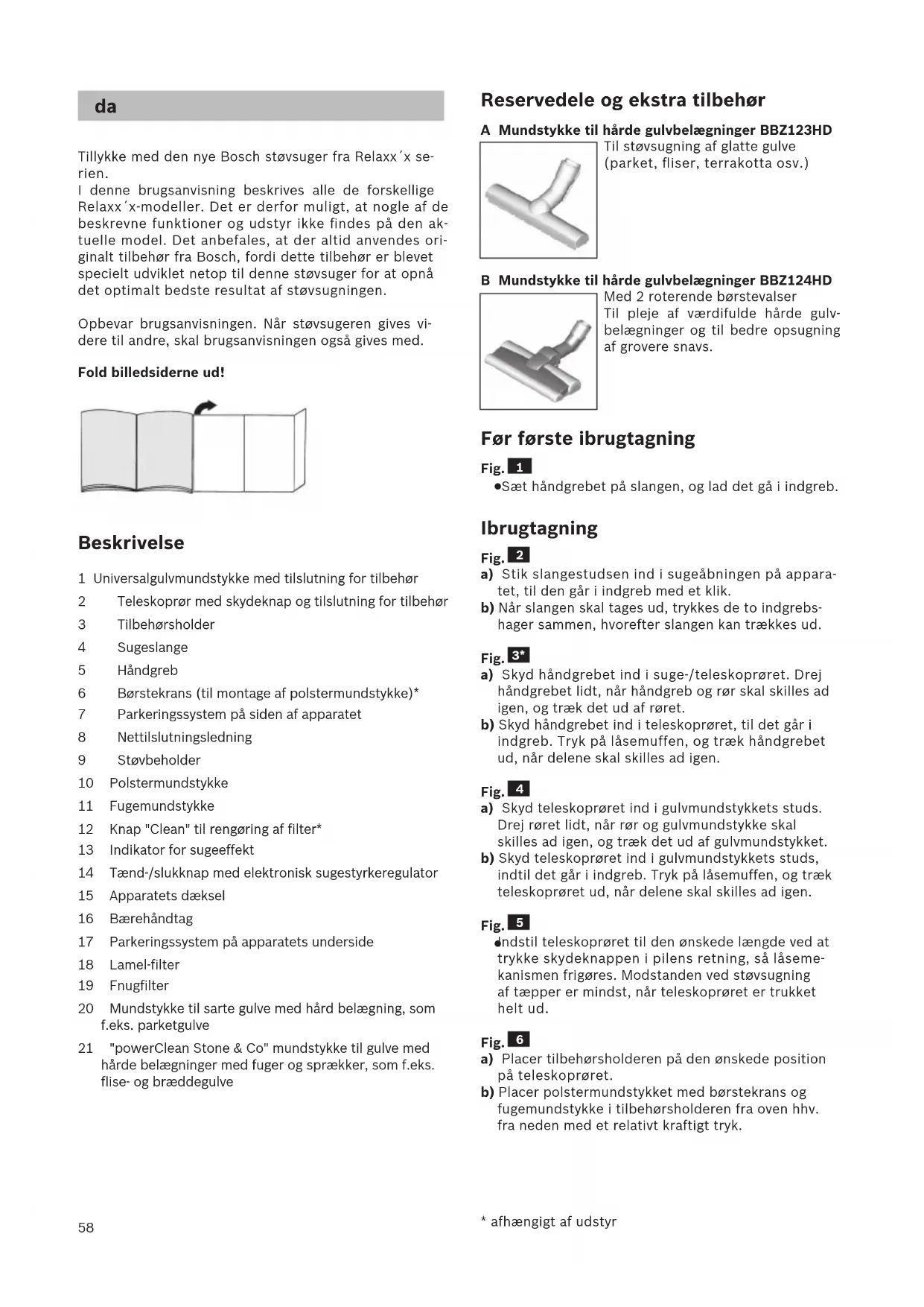 - afhankelijk van de uitvoering58 Tillykke med den nye Bosch støvsuger fra Relaxx´x se- rien. I denne brugsanvisning beskrives alle de forskellige Relaxx´x-modeller. Det er derfor muligt, at nogle af de beskrevne funktioner og udstyr ikke findes på den ak- tuelle model. Det anbefales, at der altid anvendes ori- ginalt tilbehør fra Bosch, fordi dette tilbehør er blevet specielt udviklet netop til denne støvsuger for at opnå det optimalt bedste resultat af støvsugningen. Opbevar brugsanvisningen. Når støvsugeren gives vi- dere til andre, skal brugsanvisningen også gives med. Fold billedsiderne ud! Beskrivelse 1 Universalgulvmundstykke med tilslutning for tilbehør 2 Teleskoprør med skydeknap og tilslutning for tilbehør 3 Tilbehørsholder 4 Sugeslange 5 Håndgreb 6 Børstekrans (til montage af polstermundstykke)* 7 Parkeringssystem på siden af apparatet 8 Nettilslutningsledning 9 Støvbeholder 10 Polstermundstykke 11 Fugemundstykke 12 Knap "Clean" til rengøring af filter* 13 Indikator for sugeeffekt 14 Tænd-/slukknap med elektronisk sugestyrkeregulator 15 Apparatets dæksel 16 Bærehåndtag 17 Parkeringssystem på apparatets underside 18 Lamel-filter 19 Fnugfilter 20 Mundstykke til sarte gulve med hård belægning, som f.eks. parketgulve 21 "powerClean Stone & Co" mundstykke til gulve med hårde belægninger med fuger og sprækker, som f.eks. flise- og bræddegulve Reservedele og ekstra tilbehør A Mundstykke til hårde gulvbelægninger BBZ123HD Til støvsugning af glatte gulve (parket, fliser, terrakotta osv.) B Mundstykke til hårde gulvbelægninger BBZ124HD