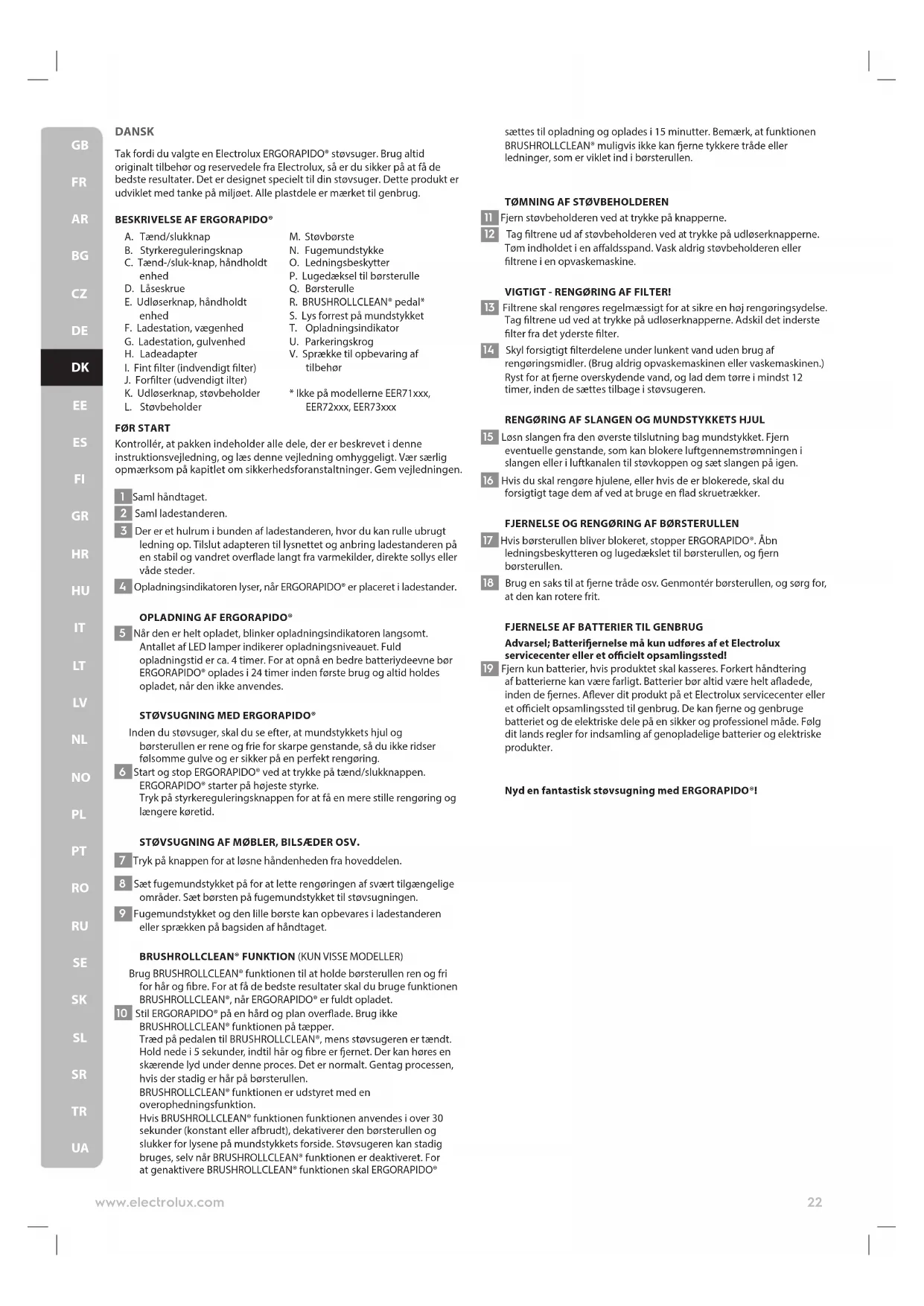UADANSK Tak fordi du valgte en Electrolux ERGORAPIDO® støvsuger. Brug altid originalt tilbehør og reservedele fra Electrolux, så er du sikker på at få de bedste resultater. Det er designet specielt til din støvsuger. Dette produkt er udviklet med tanke på miljøet. Alle plastdele er mærket til genbrug.