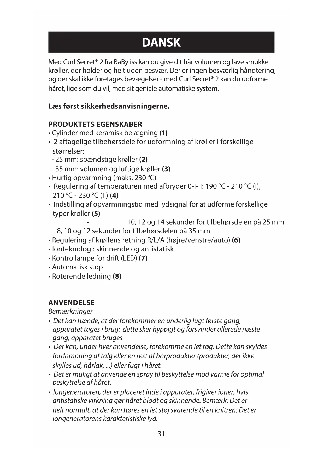 - Der kan, under hver anvendelse, forekomme en let røg. Dette kan skyldes fordampning af talg eller en rest af hårprodukter (produkter, der ikke skylles ud, hårlak, ...) eller fugt i håret.
