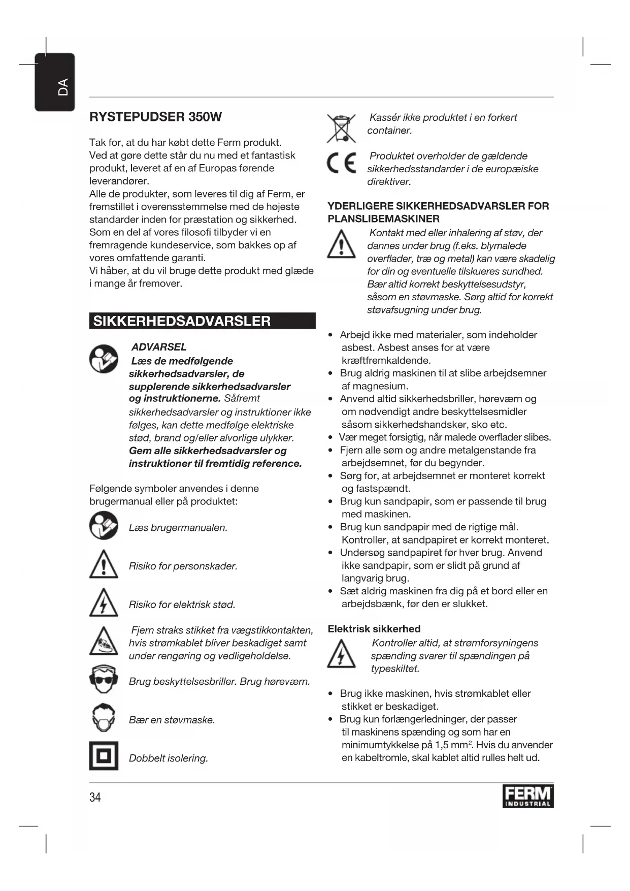 RYSTEPUDSER 350W Tak for, at du har købt dette Ferm produkt. Ved at gøre dette står du nu med et fantastisk produkt, leveret af en af Europas førende leverandører. Alle de produkter, som leveres til dig af Ferm, er fremstillet i overensstemmelse med de højeste standarder inden for præstation og sikkerhed. Som en del af vores filosofi tilbyder vi en fremragende kundeservice, som bakkes op af vores omfattende garanti. Vi håber, at du vil bruge dette produkt med glæde i mange år fremover. SIKKERHEDSADVARSLER ADVARSEL Læs de medfølgende sikkerhedsadvarsler, de supplerende sikkerhedsadvarsler og instruktionerne. Såfremt sikkerhedsadvarsler og instruktioner ikke følges, kan dette medfølge elektriske stød, brand og/eller alvorlige ulykker. Gem alle sikkerhedsadvarsler og instruktioner til fremtidig reference. Følgende symboler anvendes i denne brugermanual eller på produktet: Læs brugermanualen. Risiko for personskader. Risiko for elektrisk stød. Fjern straks stikket fra vægstikkontakten, hvis strømkablet bliver beskadiget samt under rengøring og vedligeholdelse. Brug beskyttelsesbriller. Brug høreværn. Bær en støvmaske. Dobbelt isolering. Kassér ikke produktet i en forkert container. Produktet overholder de gældende sikkerhedsstandarder i de europæiske direktiver.
