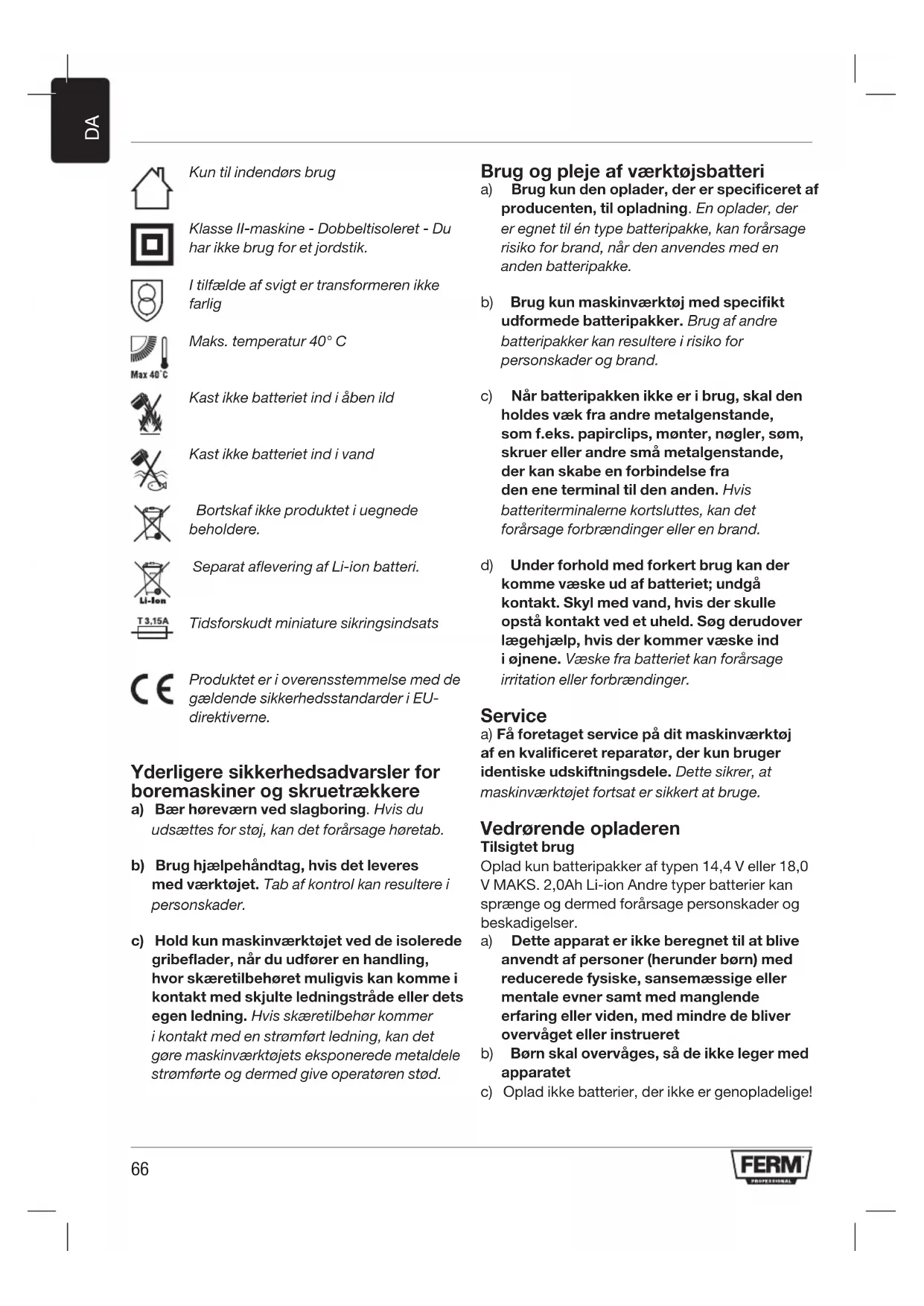 Kun til indendørs brug Klasse II-maskine - Dobbeltisoleret - Du har ikke brug for et jordstik. I tilfælde af svigt er transformeren ikke farlig Maks. temperatur 40° C Kast ikke batteriet ind i åben ild Kast ikke batteriet ind i vand Bortskaf ikke produktet i uegnede beholdere. Separat aflevering af Li-ion batteri. Tidsforskudt miniature sikringsindsats Produktet er i overensstemmelse med de gældende sikkerhedsstandarder i EU- direktiverne. Yderligere sikkerhedsadvarsler for boremaskiner og skruetrækkere a) Bær høreværn ved slagboring. Hvis du udsættes for støj, kan det forårsage høretab. b) Brug hjælpehåndtag, hvis det leveres med værktøjet. Tab af kontrol kan resultere i personskader. c) Hold kun maskinværktøjet ved de isolerede gribeflader, når du udfører en handling, hvor skæretilbehøret muligvis kan komme i kontakt med skjulte ledningstråde eller dets egen ledning. Hvis skæretilbehør kommer i kontakt med en strømført ledning, kan det gøre maskinværktøjets eksponerede metaldele strømførte og dermed give operatøren stød. Brug og pleje af værktøjsbatteri a) Brug kun den oplader, der er specificeret af producenten, til opladning. En oplader, der er egnet til én type batteripakke, kan forårsage risiko for brand, når den anvendes med en anden batteripakke. b) Brug kun maskinværktøj med specifikt udformede batteripakker. Brug af andre batteripakker kan resultere i risiko for personskader og brand. c) Når batteripakken ikke er i brug, skal den holdes væk fra andre metalgenstande, som f.eks. papirclips, mønter, nøgler, søm, skruer eller andre små metalgenstande, der kan skabe en forbindelse fra den ene terminal til den anden. Hvis batteriterminalerne kortsluttes, kan det forårsage forbrændinger eller en brand. d) Under forhold med forkert brug kan der komme væske ud af batteriet; undgå kontakt. Skyl med vand, hvis der skulle opstå kontakt ved et uheld. Søg derudover lægehjælp, hvis der kommer væske ind i øjnene. Væske fra batteriet kan forårsage irritation eller forbrændinger. Service a) Få foretaget service på dit maskinværktøj af en kvalificeret reparatør, der kun bruger identiske udskiftningsdele. Dette sikrer, at maskinværktøjet fortsat er sikkert at bruge. Vedrørende opladeren Tilsigtet brug Oplad kun batteripakker af typen 14,4 V eller 18,0 V MAKS. 2,0Ah Li-ion Andre typer batterier kan sprænge og dermed forårsage personskader og beskadigelser. a) Dette apparat er ikke beregnet til at blive anvendt af personer (herunder børn) med reducerede fysiske, sansemæssige eller mentale evner samt med manglende erfaring eller viden, med mindre de bliver overvåget eller instrueret b) Børn skal overvåges, så de ikke leger med apparatet c) Oplad ikke batterier, der ikke er genopladelige!67