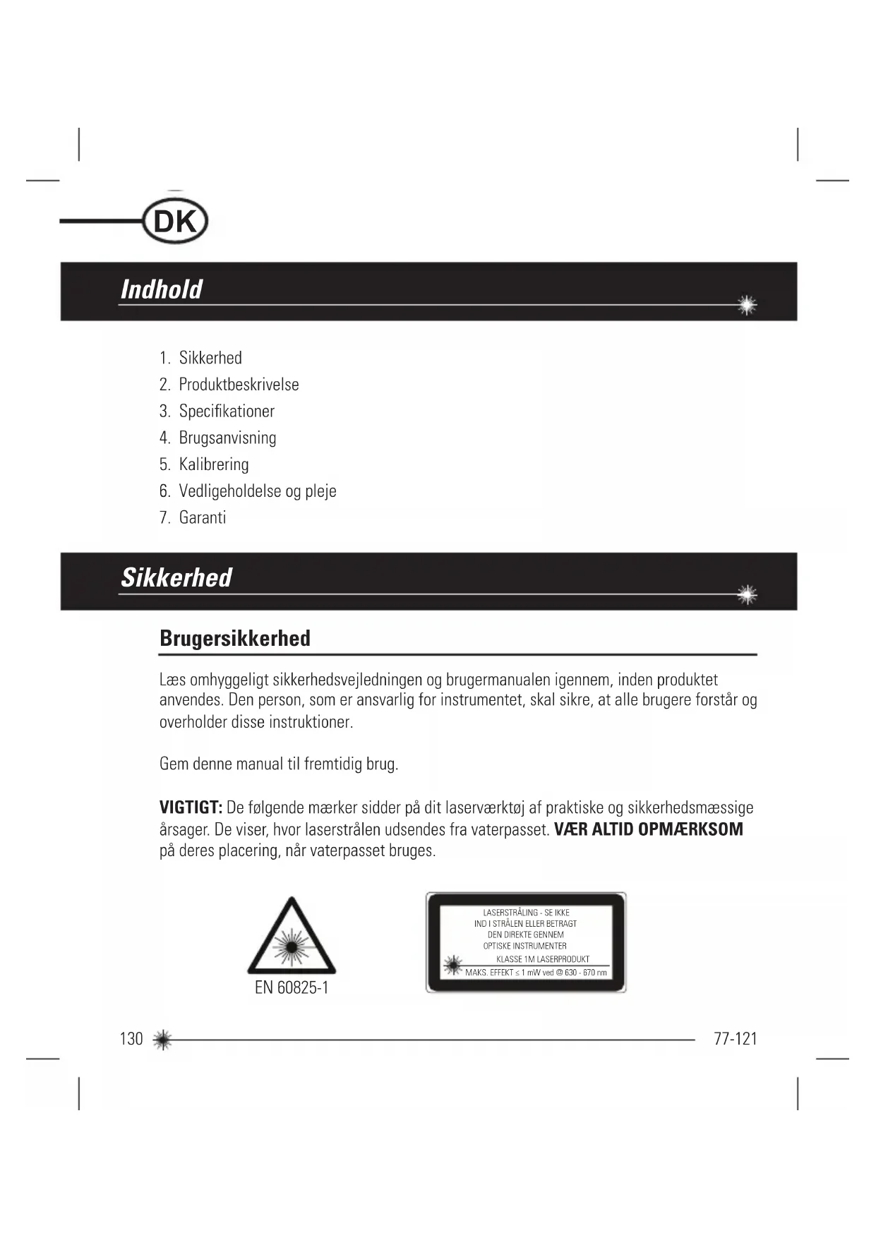 LT LT LT LT TR TR TR HR HR HR HR131 77-121 DER MÅ IKKE fjernes nogen advarselsmærkater fra kabinettet. Dette instrument må kun anvendes til nivellerings- og opmålingsopgaver, som det er beskrevet i denne manual. VÆR ALTID sikker på, at omkringstående personer i nærheden af arbejdsstedet er gjort opmærksomme på faren ved at se direkte ind i laserværktøjet. MÅ IKKE anvendes sammen med andre optiske instrumenter. Instrumentet må ikke ændres, manipuleres eller anvendes til andre formål end dem, der er beskrevet i manualen. SE IKKE ind i strålen med optiske hjælpemidler, så som forstørrelsesglas, kikkerter eller teleskoper. KIG IKKE direkte ind i laserstrålen, og ret den ikke direkte mod andre personer. Sørg for, at instrumentet ikke anbringes i øjenhøjde. Øjnene beskyttes normalt af de naturlige afværgereaktioner så som blinkerefleksen. RET IKKE laserstrålen direkte mod andre personer. SÆT ALTID laserværktøjet på "OFF” (SLUKKET), når det ikke er i brug. Hvis laserværktøjet efterlades på "ON” (TÆNDT), øger det faren for, at nogen ved et uheld kommer til at se ind i laserstrålen. UNDLAD at bruge laserværktøjet på letantændelige steder, f.eks. hvor der findes brændbare væsker, gasser eller støv. UNDLAD at skille laserværktøjet ad. Det indeholder ingen dele, som brugeren kan reparere. Hvis laserværktøjet skilles ad, ophæves alle garantier på værktøjet. Produktet må ikke ændres på nogen måde. Ændringer af laserværktøjet kan føre til strålingsfare. ANVEND IKKE instrumentet på steder, hvor der er fare for en eksplosion. BEMÆRK: Idet laserstrålen er af den fokuserede type, skal strålens bane kontrolleres over en relativ lang afstand, og der skal træffes alle nødvendige forholdsregler for at sikre, at strålen ikke kan ramme andre personer.132 77-121 ADVARSEL: Batterier kan eksplodere eller lække og forårsage skader eller brand. Risikoen herfor kan begrænses: FØLG ALTID alle instruktioner og advarsler på batterimærket og -pakken. UNDLAD at kortslutte batteripolerne. UNDLAD at oplade alkaliske batterier. UNDLAD at blande gamle og nye batterier. Udskift alle batterier med nye batterier af ens mærke og type på én gang. UNDLAD at blande batterier med forskellig type kemi. UNDLAD at brænde batterierne. OPBEVAR ALTID batterier utilgængeligt for børn. FJERN ALTID batterierne, hvis værktøjet ikke skal bruges i flere måneder. BEMÆRK: Sørg for at anvende de korrekte, anbefalede batterier. BEMÆRK: Sørg for at indsætte batterierne korrekt og med korrekt polaritet. UNDLAD AT kassere dette produkt sammen med husholdningsaffald. AFHÆND ALTID batterierne i overensstemmelse med lokale love. GENBRUG VENLIGST i overensstemmelse med de lokale bestemmelser for indsamling og bortskaffelse af elektrisk og elektronisk affald iflg. WEEE-direktivet. Batterisikkerhed Efter endt brugstid133 77-121