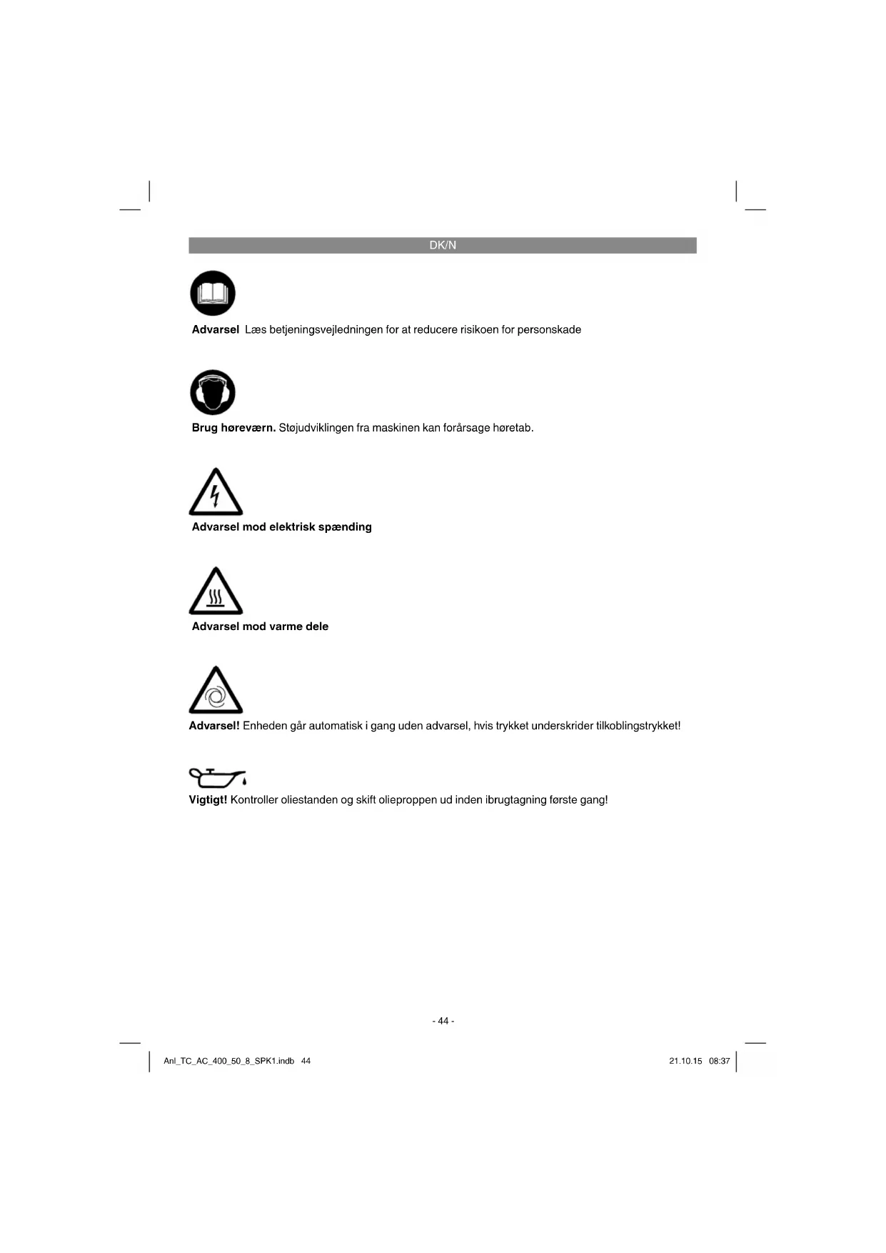 Advarsel mod elektrisk spænding Advarsel mod varme dele Advarsel! Enheden går automatisk i gang uden advarsel, hvis trykket underskrider tilkoblingstrykket! Vigtigt! Kontroller oliestanden og skift olieproppen ud inden ibrugtagning første gang! Brug høreværn. Støjudviklingen fra maskinen kan forårsage høretab. Advarsel Læs betjeningsvejledningen for at reducere risikoen for personskade Anl_TC_AC_400_50_8_SPK1.indb 44Anl_TC_AC_400_50_8_SPK1.indb 44 21.10.15 08:3721.10.15 08:37DK/N