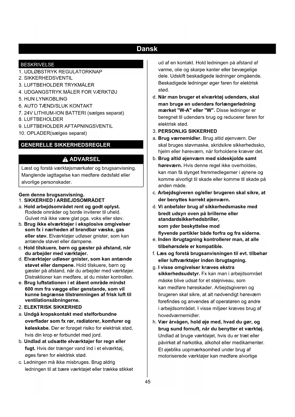 f. Læs og forstå brugsanvisningen til evt. tilbehør eller luftværktøjer inden ibrugtagning.