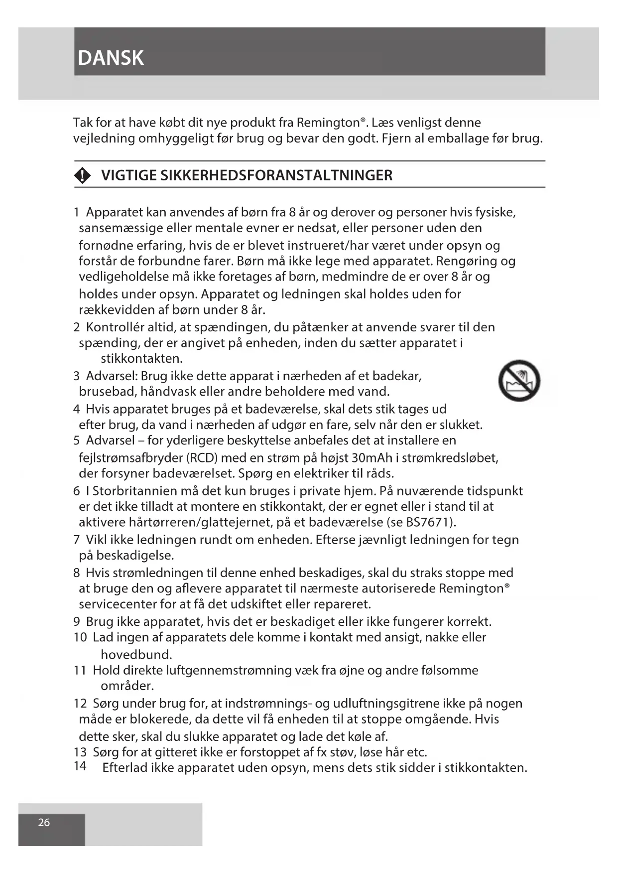 8 Hvis strømledningen til denne enhed beskadiges, skal du straks stoppe med at bruge den og aflevere apparatet til nærmeste autoriserede Remington® servicecenter for at få det udskiftet eller repareret.