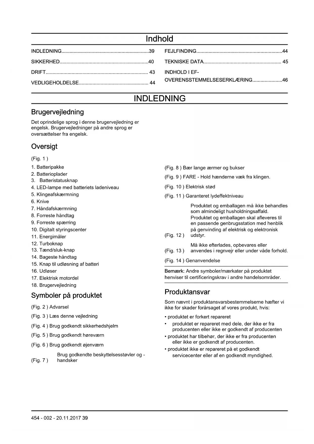 Symboler på produktet (Fig. 2 ) Advarsel (Fig. 3 ) Læs denne vejledning (Fig. 4 ) Brug godkendt sikkerhedshjelm (Fig. 5 ) Brug godkendt høreværn (Fig. 6 ) Brug godkendt øjenværn (Fig. 7 ) Brug godkendte beskyttelsesstøvler og - handsker (Fig. 8 ) Bær lange ærmer og bukser (Fig. 9 ) FARE ‐ Hold hænderne væk fra klingen. (Fig. 10 ) Elektrisk stød (Fig. 11 ) Garanteret lydeffektniveau (Fig. 12 ) Produktet og emballagen må ikke behandles som almindeligt husholdningsaffald. Produktet og emballagen skal afleveres til en passende genbrugsstation med henblik på genvinding af elektrisk og elektronisk udstyr. (Fig. 13 ) Må ikke efterlades, opbevares eller anvendes i regnvejr eller under våde forhold. (Fig. 14 ) Genanvendelse Bemærk: Andre symboler/mærkater på produktet henviser til certificeringskrav i andre handelsområder. Produktansvar Som nævnt i produktansvarsbestemmelserne hæfter vi ikke for skader forårsaget af vores produkt, hvis: