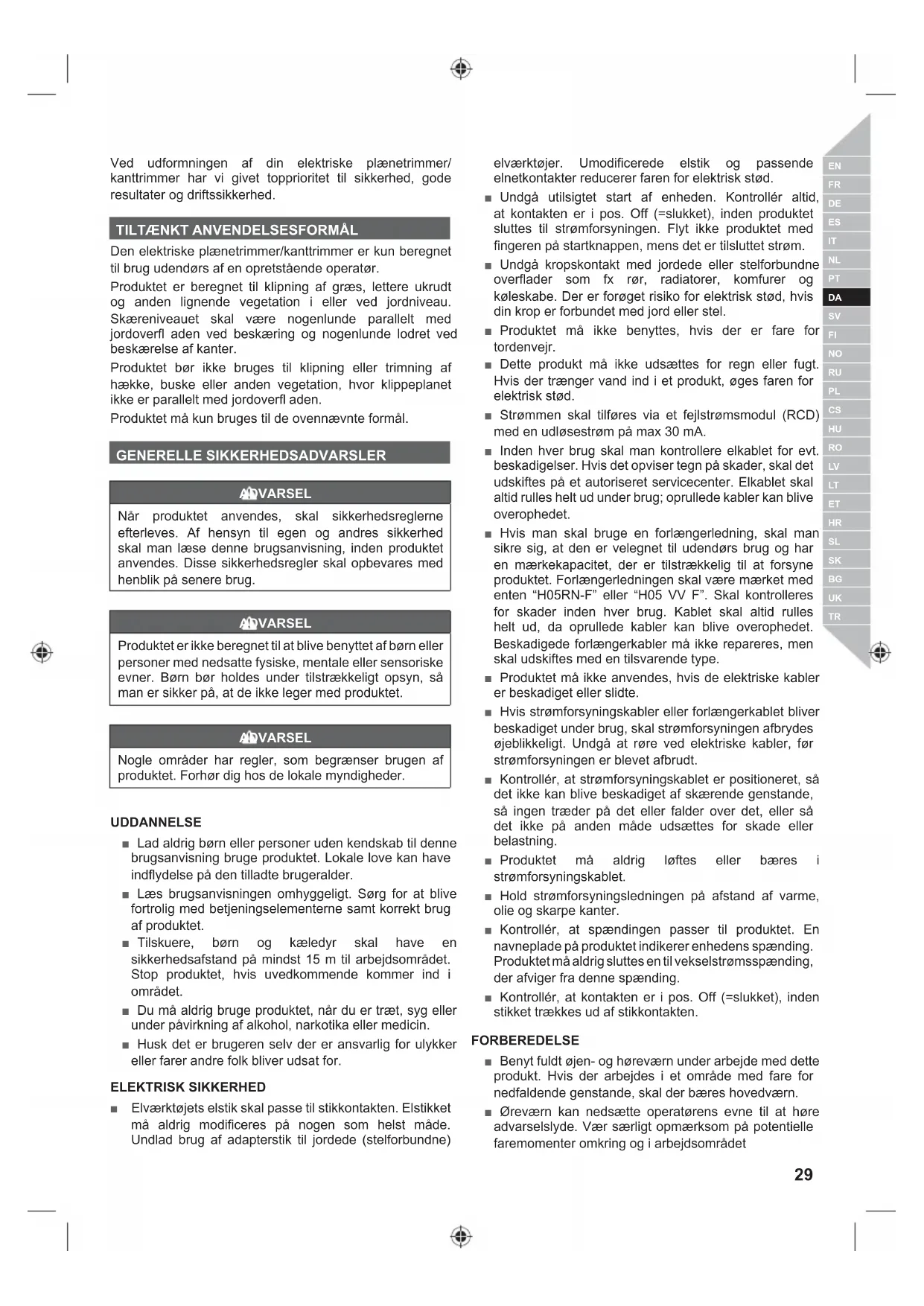 Den elektriske plænetrimmer/kanttrimmer er kun beregnet til brug udendørs af en opretstående operatør. Produktet er beregnet til klipning af græs, lettere ukrudt og anden lignende vegetation i eller ved jordniveau. Skæreniveauet skal være nogenlunde parallelt med jordoverfl aden ved beskæring og nogenlunde lodret ved beskærelse af kanter. Produktet bør ikke bruges til klipning eller trimning af hække, buske eller anden vegetation, hvor klippeplanet ikke er parallelt med jordoverfl aden. Produktet må kun bruges til de ovennævnte formål. GENERELLE SIKKERHEDSADVARSLER ADVARSEL Når produktet anvendes, skal sikkerhedsreglerne efterleves. Af hensyn til egen og andres sikkerhed skal man læse denne brugsanvisning, inden produktet anvendes. Disse sikkerhedsregler skal opbevares med henblik på senere brug. ADVARSEL Produktet er ikke beregnet til at blive benyttet af børn eller personer med nedsatte fysiske, mentale eller sensoriske evner. Børn bør holdes under tilstrækkeligt opsyn, så man er sikker på, at de ikke leger med produktet. ADVARSEL Nogle områder har regler, som begrænser brugen af produktet. Forhør dig hos de lokale myndigheder. UDDANNELSE ■ Lad aldrig børn eller personer uden kendskab til denne brugsanvisning bruge produktet. Lokale love kan have indflydelse på den tilladte brugeralder. ■ Læs brugsanvisningen omhyggeligt. Sørg for at blive fortrolig med betjeningselementerne samt korrekt brug af produktet. ■ Tilskuere, børn og kæledyr skal have en sikkerhedsafstand på mindst 15 m til arbejdsområdet. Stop produktet, hvis uvedkommende kommer ind i området. ■ Du må aldrig bruge produktet, når du er træt, syg eller under påvirkning af alkohol, narkotika eller medicin. ■ Husk det er brugeren selv der er ansvarlig for ulykker eller farer andre folk bliver udsat for. ELEKTRISK SIKKERHED ■ Elværktøjets elstik skal passe til stikkontakten. Elstikket må aldrig modificeres på nogen som helst måde. Undlad brug af adapterstik til jordede (stelforbundne) elværktøjer. Umodificerede elstik og passende elnetkontakter reducerer faren for elektrisk stød. ■ Undgå utilsigtet start af enheden. Kontrollér altid, at kontakten er i pos. Off (=slukket), inden produktet sluttes til strømforsyningen. Flyt ikke produktet med fingeren på startknappen, mens det er tilsluttet strøm. ■ Undgå kropskontakt med jordede eller stelforbundne overflader som fx rør, radiatorer, komfurer og køleskabe. Der er forøget risiko for elektrisk stød, hvis din krop er forbundet med jord eller stel. ■ Produktet må ikke benyttes, hvis der er fare for tordenvejr. ■ Dette produkt må ikke udsættes for regn eller fugt. Hvis der trænger vand ind i et produkt, øges faren for elektrisk stød. ■ Strømmen skal tilføres via et fejlstrømsmodul (RCD) med en udløsestrøm på max 30 mA. ■ Inden hver brug skal man kontrollere elkablet for evt. beskadigelser. Hvis det opviser tegn på skader, skal det udskiftes på et autoriseret servicecenter. Elkablet skal altid rulles helt ud under brug; oprullede kabler kan blive overophedet. ■ Hvis man skal bruge en forlængerledning, skal man sikre sig, at den er velegnet til udendørs brug og har en mærkekapacitet, der er tilstrækkelig til at forsyne produktet. Forlængerledningen skal være mærket med enten “H05RN-F” eller “H05 VV F”. Skal kontrolleres for skader inden hver brug. Kablet skal altid rulles helt ud, da oprullede kabler kan blive overophedet. Beskadigede forlængerkabler må ikke repareres, men skal udskiftes med en tilsvarende type. ■ Produktet må ikke anvendes, hvis de elektriske kabler er beskadiget eller slidte. ■ Hvis strømforsyningskabler eller forlængerkablet bliver beskadiget under brug, skal strømforsyningen afbrydes øjeblikkeligt. Undgå at røre ved elektriske kabler, før strømforsyningen er blevet afbrudt. ■ Kontrollér, at strømforsyningskablet er positioneret, så det ikke kan blive beskadiget af skærende genstande, så ingen træder på det eller falder over det, eller så det ikke på anden måde udsættes for skade eller belastning. ■ Produktet må aldrig løftes eller bæres i strømforsyningskablet. ■ Hold strømforsyningsledningen på afstand af varme, olie og skarpe kanter. ■ Kontrollér, at spændingen passer til produktet. En navneplade på produktet indikerer enhedens spænding. Produktet må aldrig sluttes en til vekselstrømsspænding, der afviger fra denne spænding. ■ Kontrollér, at kontakten er i pos. Off (=slukket), inden stikket trækkes ud af stikkontakten. FORBEREDELSE ■ Benyt fuldt øjen- og høreværn under arbejde med dette produkt. Hvis der arbejdes i et område med fare for nedfaldende genstande, skal der bæres hovedværn. ■ Øreværn kan nedsætte operatørens evne til at høre advarselslyde. Vær særligt opmærksom på potentielle faremomenter omkring og i arbejdsområdet30 | Dansk ■ Bær kraftige, lange bukser, støvler og handsker. Undlad at bære løstsiddende tøj, korte bukser, smykker af enhver art eller gå barfodet. ■ Langt hår skal bindes op over skulderniveau, så det ikke risikerer at vikle sig ind i bevægelige dele. ■ Inden ibrugtagning og efter enhver ydre påvirkning skal man kontrollere, at der ikke findes beskadigede dele. En defekt kontakt eller en del, som er blevet beskadiget eller slidt, skal repareres ordentligt eller udskiftes på et autoriseret serviceværksted. ■ Kontrollér, at klippeudstyret er monteret korrekt og ordentligt fastgjort. ■ Produktet må aldrig benyttes, før alle skærme, deflektorer og håndtag er fastgjort ordentligt og sikkert. ■ Overvej grundigt hvilken type arbejdsmiljø du befinder dig i. Hold arbejdsområdet ryddet for ledninger, pinde, sten og affald, som ved kontakt med klipperen kan blive til udslyngede genstande. TRÅDTRIMMER / KANTTRIMMER, SIKKERHEDSADVARSLER ■ Brug produktet i dagslys eller god kunstig belysning. ■ Undgå brug på vådt græs. ■ Undgå at g