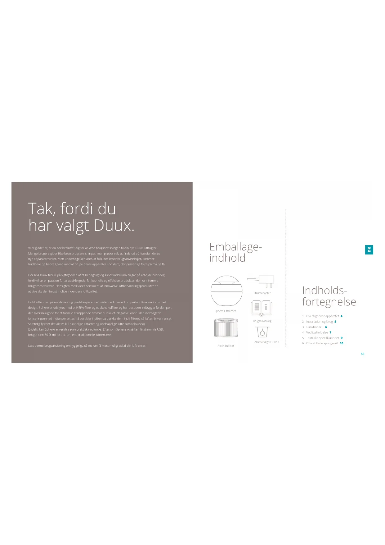 Tak, fordi du har valgt Duux. Vi er glade for, at du har besluttet dig for at læse brugsanvisningen til din nye Duux-luftfugter! Mange brugere gider ikke læse brugsanvisninger, men prøver selv at nde ud af, hvordan deres nye apparater virker. Men undersøgelser viser, at folk, der læser brugsanvisninger, kommer hurtigere og bedre i gang med at bruge deres apparater end dem, der prøver sig frem på må og få. Her hos Duux tror vi på vigtigheden af et behageligt og sundt indeklima. Vi går på arbejde hver dag, fordi vi har en passion for at udvikle gode, funktionelle og eektive produkter, der kan fremme brugernes velvære. Hensigten med vores sortiment af innovative luftbehandlingsprodukter er at give dig den bedst mulige indendørs luftkvalitet. Hold luften ren på en elegant og pladsbesparende måde med denne kompakte luftrenser i et smart design. Sphere er udstyret med et HEPA-lter og et aktivt kullter og har desuden indbygget fordamper, der giver mulighed for at fordele afslappende aromaer i lokalet. Negative ioner i den indbyggede ioniseringsenhed indfanger bittesmå partikler i luften og trække dem ind i lteret, så luften bliver renset. Samtidig fjerner det aktive kul skadelige luftarter og ubehagelige lufte som tobaksrøg. Endelig kan Sphere anvendes som praktisk natlampe. Eftersom Sphere også kan få strøm via USB, bruger den 80% mindre strøm end traditionelle luftrensere. Læs denne brugsanvisning omhyggeligt, så du kan få mest muligt ud af din luftrenser.