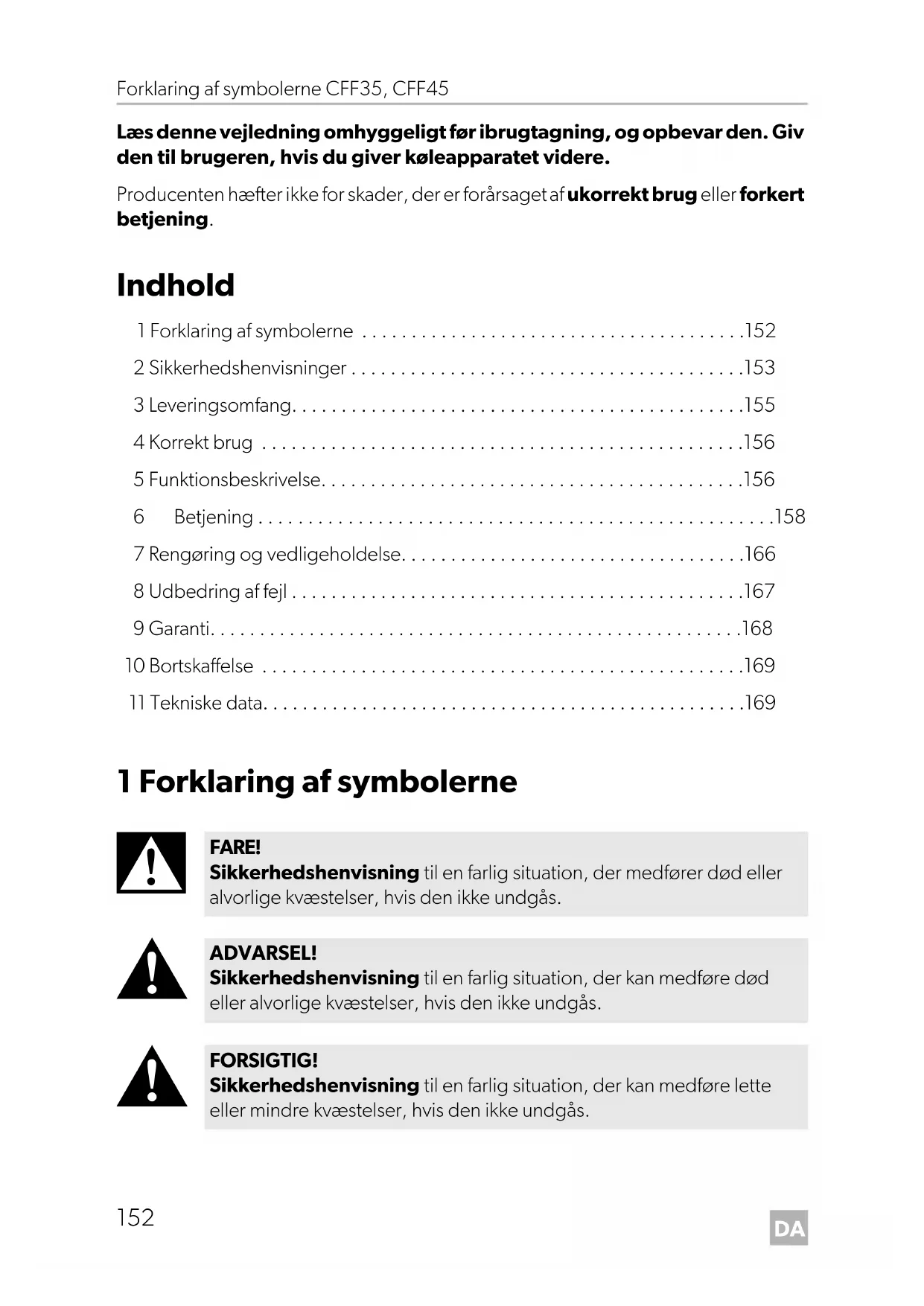 FARE! Sikkerhedshenvisning til en farlig situation, der medfører død eller alvorlige kvæstelser, hvis den ikke undgås. ADVARSEL! Sikkerhedshenvisning til en farlig situation, der kan medføre død eller alvorlige kvæstelser, hvis den ikke undgås. FORSIGTIG! Sikkerhedshenvisning til en farlig situation, der kan medføre lette eller mindre kvæstelser, hvis den ikke undgås. DometicCFF35-45_OPM_4445102909_EMEA16.book Seite 152 Donnerstag, 13. Februar 2020 2:24 14DA CFF35, CFF45 Sikkerhedshenvisninger