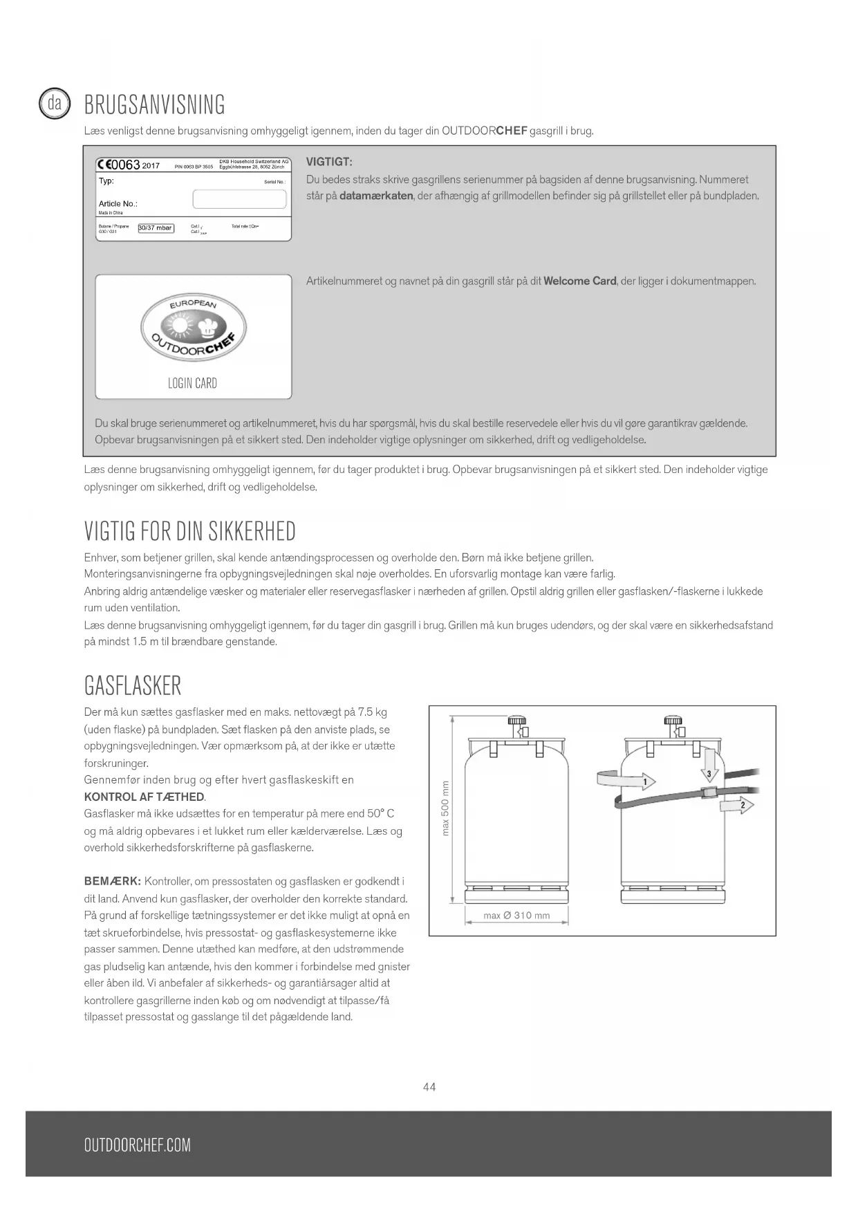 BRUGSANVISNING 44 Læs denne vejledning omhyggeligt igennem, før du tager din OUTDOORCHEF gasgrill i brug.