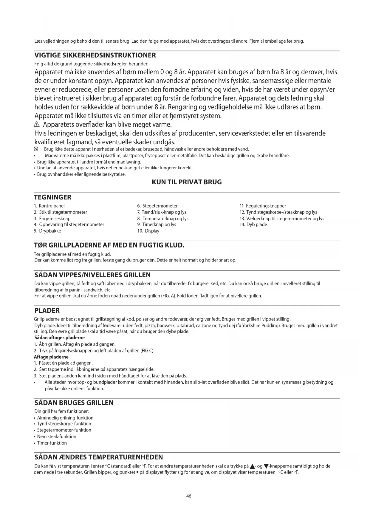 Du kan vippe grillen, så fedt og saft løber ned i drypbakken, når du tilbereder fx burgere, kød, etc. Du kan også bruge grillen i nivelleret stilling til tilberedning af fx panini, sandwich, etc. For at vippe grillen skal du åbne foden opad nedenunder grillen (FIG. A). Fold foden adt igen for at nivellere grillen. PLADER Grillpladerne er bedst egnet til grillstegning af kød, pølser og andre fødevarer, der afgiver fedt. Bruges med grillen i vippet stilling. Dyb plade: Ideel til tilberedning af fødevarer uden fedt, pizza, bagværk, pitabrød, calzone og tynd dej (fx Yorkshire Pudding). Bruges med grillen i vandret stilling. Den øvre grillplade skal altid være påsat, når du bruger den dybe plade. Sådan aftages pladerne