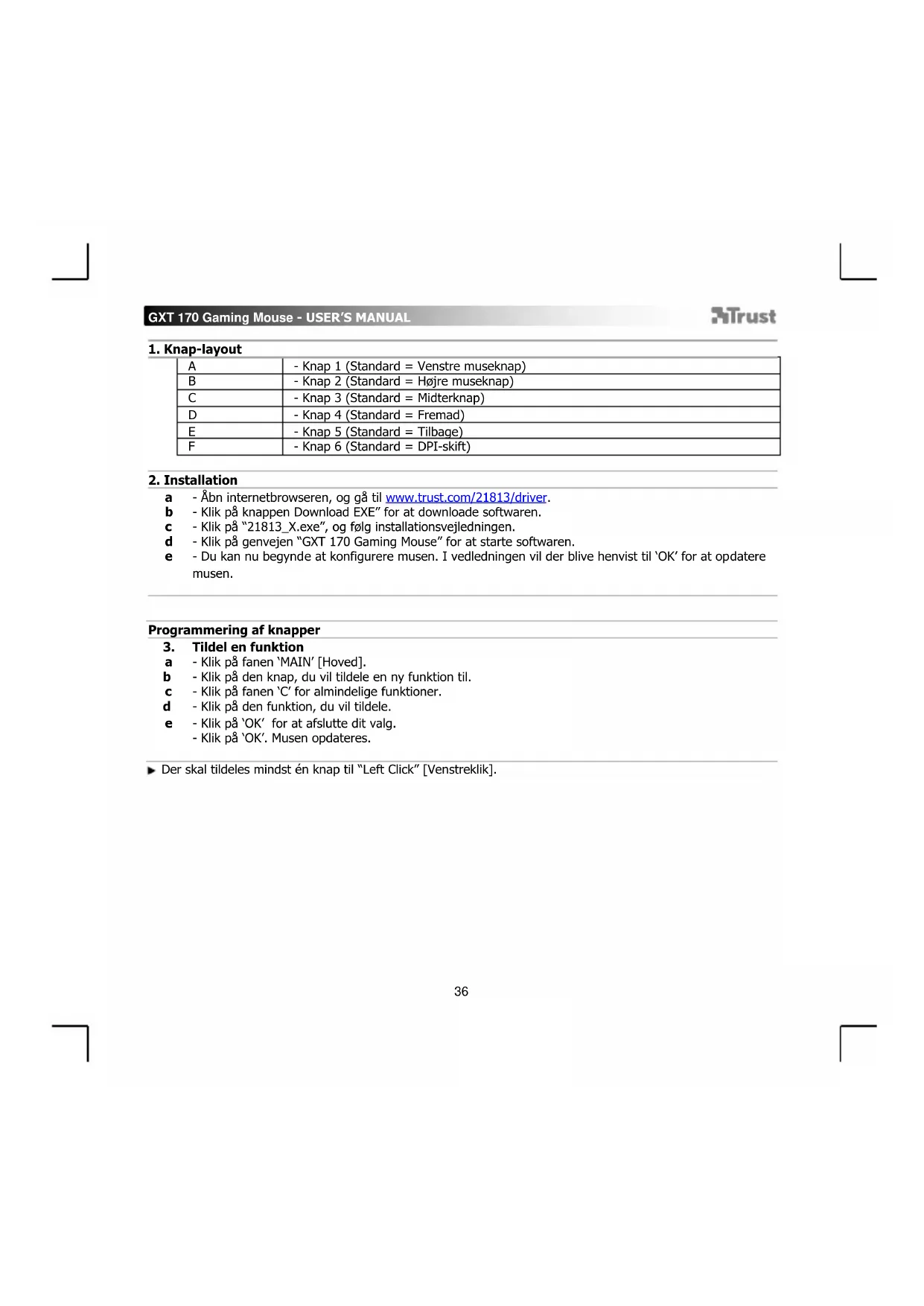 Tildel en makro - Klik på fanen ‘MAIN’ [Hoved]. - Klik på den knap, som du vil tildele makroen til. - Klik på fanen ‘Macro selection’ [Valg af makro]. - Klik på den ønskede makro. - Klik på ‘OK’ for at vælge makroen. - Klik på ‘OK’. Musen opdateres.GXT 170 Gaming Mouse - USER’S MANUAL