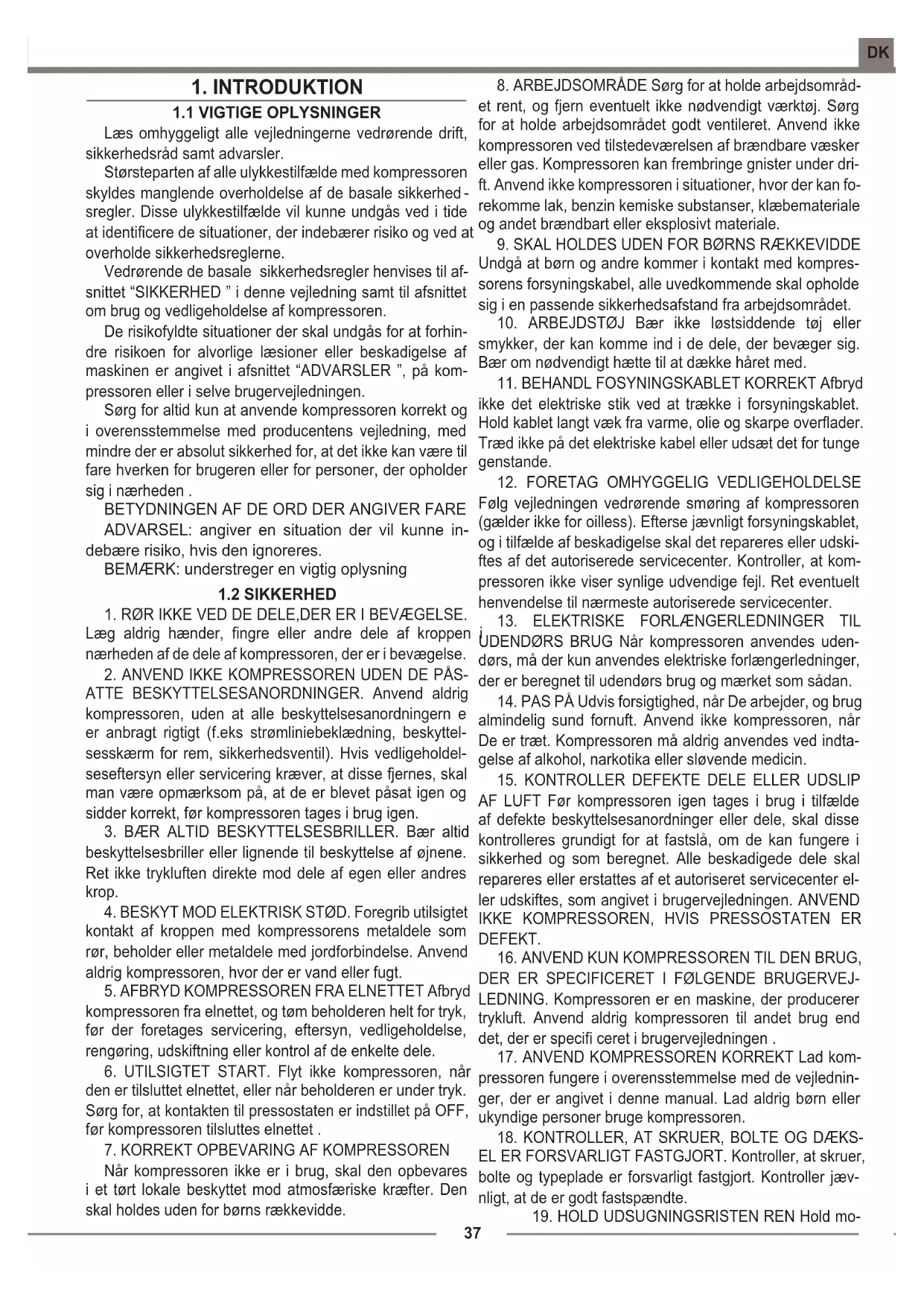 sregler. Disse ulykkestilfælde vil kunne undgås ved i tide at identicere de situationer, der indebærer risiko og ved at overholde sikkerhedsreglerne. Vedrørende de basale sikkerhedsregler henvises til af- snittet “SIKKERHED ” i denne vejledning samt til afsnittet om brug og vedligeholdelse af kompressoren. De risikofyldte situationer der skal undgås for at forhin- dre risikoen for alvorlige læsioner eller beskadigelse af maskinen er angivet i afsnittet “ADVARSLER ”, på kom- pressoren eller i selve brugervejledningen. Sørg for altid kun at anvende kompressoren korrekt og i overensstemmelse med producentens vejledning, med mindre der er absolut sikkerhed for, at det ikke kan være til fare hverken for brugeren eller for personer, der opholder sig i nærheden . BETYDNINGEN AF DE ORD DER ANGIVER FARE ADVARSEL: angiver en situation der vil kunne in- debære risiko, hvis den ignoreres. BEMÆRK: understreger en vigtig oplysning