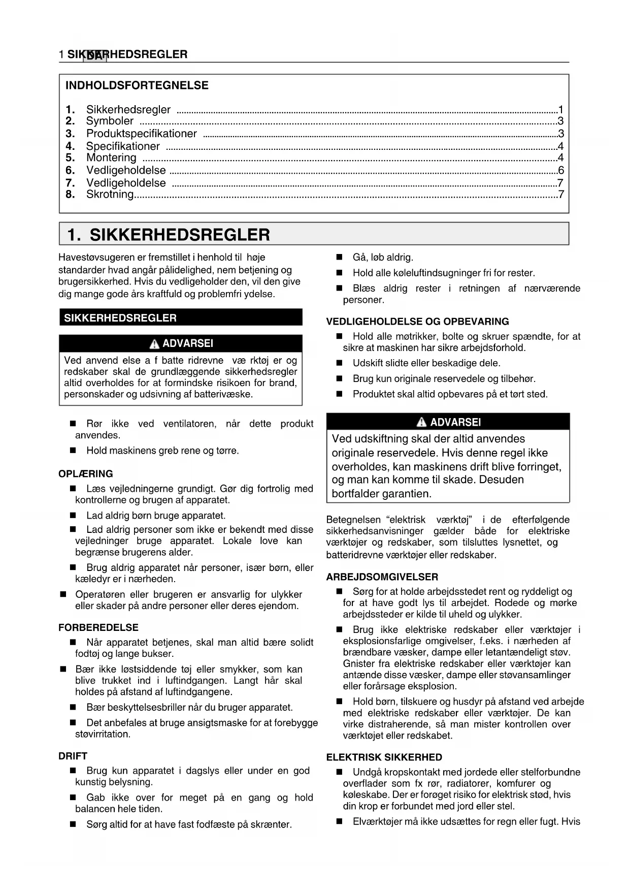 Havestøvsugeren er fremstillet i henhold til høje standarder hvad angår pålidelighed, nem betjening og brugersikkerhed. Hvis du vedligeholder den, vil den give dig mange gode års kraftfuld og problemfri ydelse. SIKKERHEDSREGLER ADVARSEl Ved anvend else a f batte ridrevne væ rktøj er og redskaber skal de grundlæggende sikkerhedsregler altid overholdes for at formindske risikoen for brand, personskader og udsivning af batterivæske. Rør ikke ved ventilatoren, når dette produkt anvendes. Hold maskinens greb rene og tørre. OPLæRING Læs vejledningerne grundigt. Gør dig fortrolig med kontrollerne og brugen af apparatet. Lad aldrig børn bruge apparatet. Lad aldrig personer som ikke er bekendt med disse vejledninger bruge apparatet. Lokale love kan begrænse brugerens alder. Brug aldrig apparatet når personer, især børn, eller kæledyr er i nærheden. Operatøren eller brugeren er ansvarlig for ulykker eller skader på andre personer eller deres ejendom. FORBEREDELSE Når apparatet betjenes, skal man altid bære solidt fodtøj og lange bukser. Bær ikke løstsiddende tøj eller smykker, som kan blive trukket ind i luftindgangen. Langt hår skal holdes på afstand af luftindgangene. Bær beskyttelsesbriller når du bruger apparatet. Det anbefales at bruge ansigtsmaske for at forebygge støvirritation. DRIFT Brug kun apparatet i dagslys eller under en god kunstig belysning. Gab ikke over for meget på en gang og hold balancen hele tiden. Sørg altid for at have fast fodfæste på skrænter. Gå, løb aldrig. Hold alle køleluftindsugninger fri for rester. Blæs aldrig rester i retningen af nærværende personer.