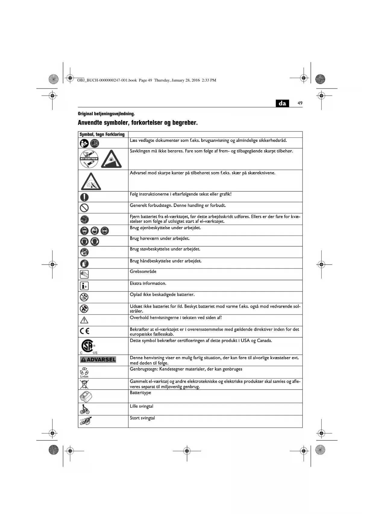 Original betjeningsvejledning. Anvendte symboler, forkortelser og begreber. Symbol, tegn Forklaring Læs vedlagte dokumenter som f.eks. brugsanvisning og almindelige sikkerhedsråd. Savklingen må ikke berøres. Fare som følge af frem- og tilbagegående skarpt tilbehør. Advarsel mod skarpe kanter på tilbehøret som f.eks. skær på skæreknivene. Følg instruktionerne i efterfølgende tekst eller grafik! Generelt forbudstegn. Denne handling er forbudt. Fjern batteriet fra el-værktøjet, før dette arbejdsskridt udføres. Ellers er der fare for kvæ- stelser som følge af utilsigtet start af el-værktøjet. Brug øjenbeskyttelse under arbejdet. Brug høreværn under arbejdet. Brug støvbeskyttelse under arbejdet. Brug håndbeskyttelse under arbejdet. Grebsområde Ekstra information. Oplad ikke beskadigede batterier. Udsæt ikke batteriet for ild. Beskyt batteriet mod varme f.eks. også mod vedvarende sol- stråler. Overhold henvisningerne i teksten ved siden af! Bekræfter at el-værktøjet er i overensstemmelse med gældende direktiver inden for det europæiske fællesskab. Dette symbol bekræfter certificeringen af dette produkt i USA og Canada. Denne henvisning viser en mulig farlig situation, der kan føre til alvorlige kvæstelser evt. med døden til følge. Genbrugstegn: Kendetegner materialer, der kan genbruges Gammelt el-værktøj og andre elektrotekniske og elektriske produkter skal samles og afle- veres separat til miljøvenlig genbrug. Batteritype Lille svingtal Stort svingtal OBJ_BUCH-0000000247-001.book Page 49 Thursday, January 28, 2016 2:33 PM50