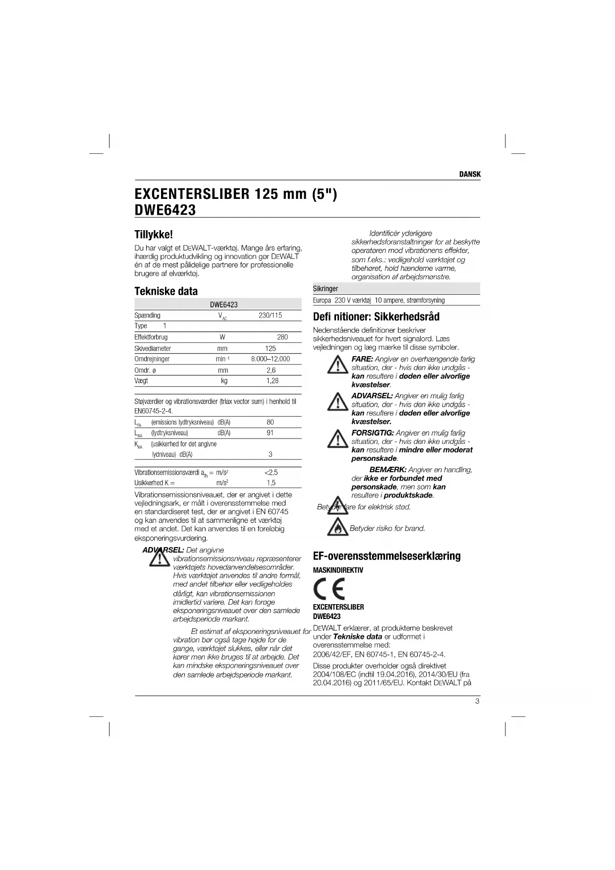 Identificér yderligere sikkerhedsforanstaltninger for at beskytte operatøren mod vibrationens effekter, som f.eks.: vedligehold værktøjet og tilbehøret, hold hænderne varme, organisation af arbejdsmønstre. Sikringer Europa 230 V værktøj 10 ampere, strømforsyning Defi nitioner: Sikkerhedsråd Nedenstående definitioner beskriver sikkerhedsniveauet for hvert signalord. Læs vejledningen og læg mærke til disse symboler. FARE: Angiver en overhængende farlig situation, der - hvis den ikke undgås - kan resultere i døden eller alvorlige kvæstelser. ADVARSEL: Angiver en mulig farlig situation, der - hvis den ikke undgås - kan resultere i døden eller alvorlige kvæstelser. FORSIGTIG: Angiver en mulig farlig situation, der - hvis den ikke undgås - kan resultere i mindre eller moderat personskade. BEMÆRK: Angiver en handling, der ikke er forbundet med personskade, men som kan resultere i produktskade. Betyder fare for elektrisk stød. Betyder risiko for brand. EF-overensstemmelseserklæring MASKINDIREKTIV EXCENTERSLIBER DWE6423 DEWALT erklærer, at produkterne beskrevet under Tekniske data er udformet i overensstemmelse med: 2006/42/EF, EN 60745-1, EN 60745-2-4. Disse produkter overholder også direktivet 2004/108/EC (indtil 19.04.2016), 2014/30/EU (fra