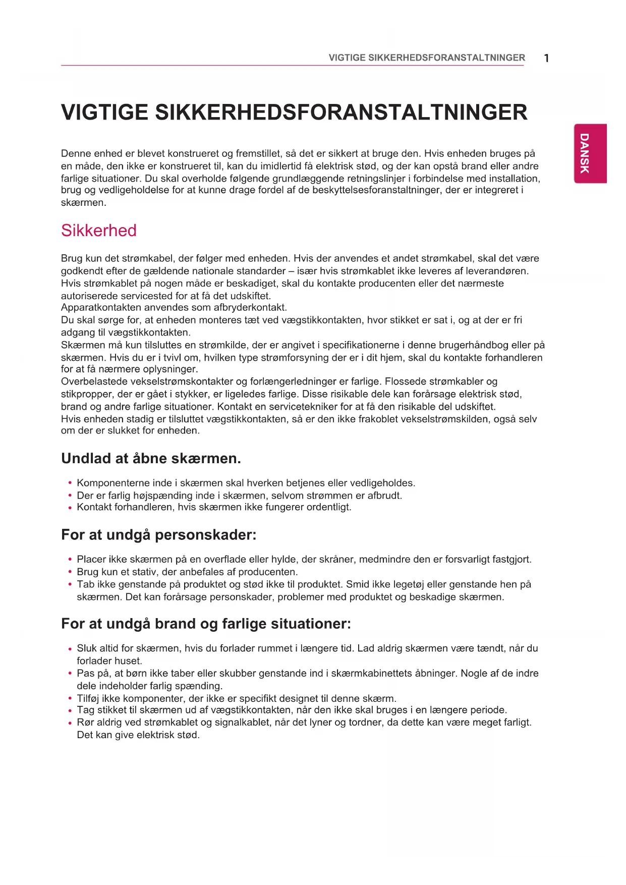 Træk stikket ud af stikkontakten, før du rengør LCD-skærmens overflade. Brug en let fugtet klud (ikke våd). Brug ikke spraymidler direkte på skærmen. Der kan forekomme elektrisk stød, hvis der påføres spraymiddel. Når du rengør produktet, skal du tage strømstikket til enheden ud og gnide forsigtigt med en blød klud, så du ikke ridser produktet. Brug ikke en våd klud under rengøringen og spray ikke vand eller andre væsker direkte på produktet. Du kan få elektrisk stød! (Anvend ikke kemikalier så som benzen, fortyndervæske til maling eller sprit). Spray vand på en blød klud 2 til 4 gange, og brug den til at rengøre frontrammen. Gnid kun i én retning. For meget fugt kan give pletter.Sørg for at strømkablet er korrekt indsat i AC-adapteren. Hvis det ikke bliver korrekt indsat, kan den dårlige forbindelse forårsage brand eller elektrisk stød.Sørg for at anvende strømkabler og AC-adaptere der er leveret og godkendt af LG Electronics, Inc. Brugen af produkter der ikke er godkendt, kan forårsage brand eller elektrisk stød.Træk altid i stikket, når du trækker strømkablet ud. Undgå at bøje strømkablet med overdreven kraft. Strømledningen kan blive beskadiget, og der kan opstå elektrisk stød eller brand.Pas på ikke at træde på eller placere tunge objekter (el-apparater, tøj, osv.) på strømkablet eller AC-adapteren. Pas på ikke at beskadige strømkablet eller AC-adapteren med skarpe genstande. Beskadigede strømkabler kan forårsage brand eller elektrisk stød.Du må aldrig reparere, modificere eller skille strømkablet eller AC-adapteren ad. Det kan forårsage brand eller elektrisk stød.Sørg for at holde kontakten, AC-adapteren og benene på stikket fri for støv og lignende. Det kan forårsage brand.