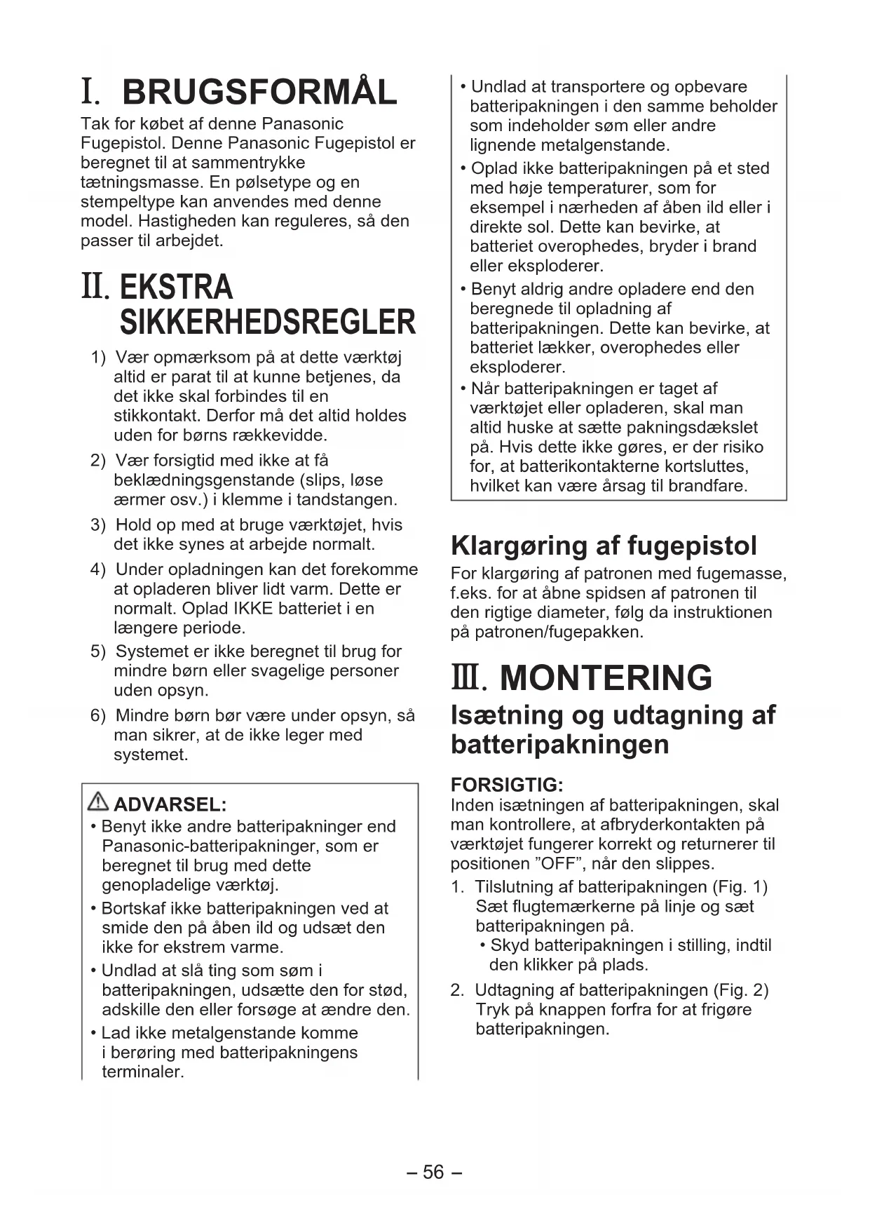 . BRUGSFORMÅL Tak for købet af denne Panasonic Fugepistol. Denne Panasonic Fugepistol er beregnet til at sammentrykke tætningsmasse. En pølsetype og en stempeltype kan anvendes med denne model. Hastigheden kan reguleres, så den passer til arbejdet.