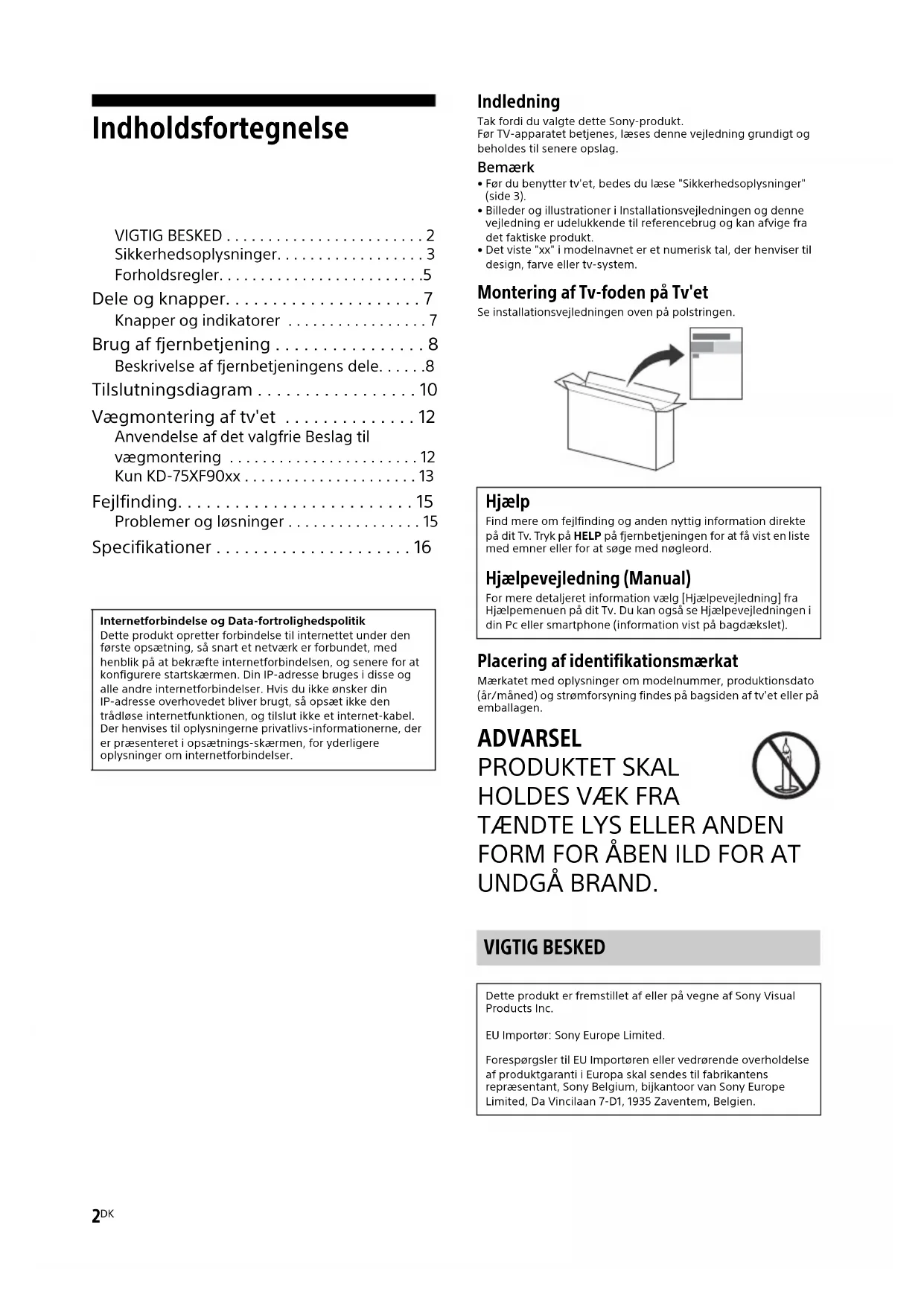 UNDGÅ BRAND. VIGTIG BESKED Internetforbindelse og Data-fortrolighedspolitikDette produkt opretter forbindelse til internettet under den første opsætning, så snart et netværk er forbundet, med henblik på at bekræfte internetforbindelsen, og senere for at konfigurere startskærmen. Din IP-adresse bruges i disse og alle andre internetforbindelser. Hvis du ikke ønsker din IP-adresse overhovedet bliver brugt, så opsæt ikke den trådløse internetfunktionen, og tilslut ikke et internet-kabel. Der henvises til oplysningerne privatlivs-informationerne, der er præsenteret i opsætnings-skærmen, for yderligere oplysninger om internetforbindelser. Hjælp Find mere om fejlfinding og anden nyttig information direkte på dit Tv. Tryk på HELP på fjernbetjeningen for at få vist en liste med emner eller for at søge med nøgleord. Hjælpevejledning (Manual) For mere detaljeret information vælg [Hjælpevejledning] fra Hjælpemenuen på dit Tv. Du kan også se Hjælpevejledningen i din Pc eller smartphone (information vist på bagdækslet).Dette produkt er fremstillet af eller på vegne af Sony Visual Products Inc.EU Importør: Sony Europe Limited.Forespørgsler til EU Importøren eller vedrørende overholdelse af produktgaranti i Europa skal sendes til fabrikantens repræsentant, Sony Belgium, bijkantoor van Sony Europe Limited, Da Vincilaan 7-D1, 1935 Zaventem, Belgien.C:\Users\CHAILING_2\Desktop\CU\EU-2\09DK\4733119112_09DA.fm master page: Right KD-75XF90xx / 65XF90xx / 55XF90xx / 49XF90xx 4-733-119-11(2)