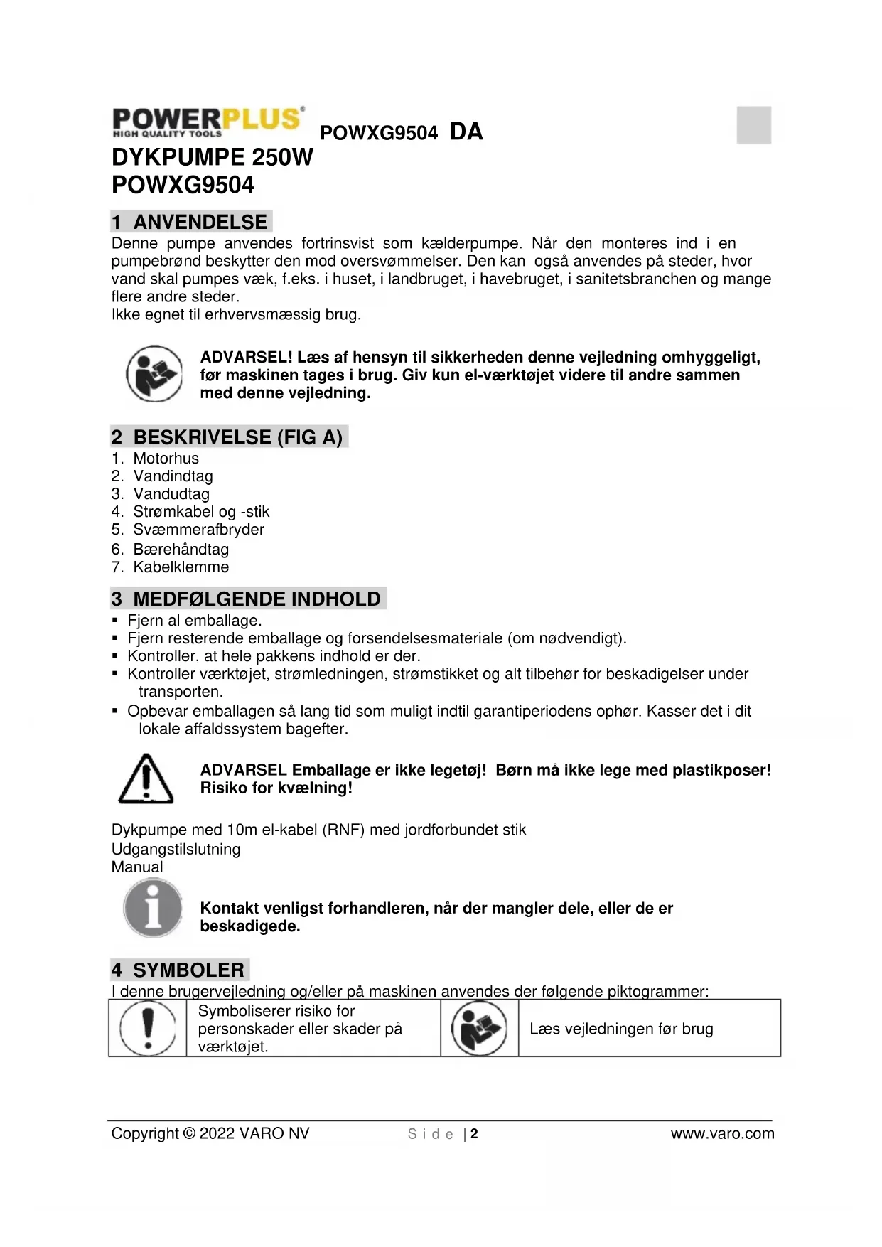 Copyright © 2022 VARO NV S i d e | 2 www.varo.com DYKPUMPE 250W POWXG9504 1 ANVENDELSE Denne pumpe anvendes fortrinsvist som kælderpumpe. Når den monteres ind i en pumpebrønd beskytter den mod oversvømmelser. Den kan også anvendes på steder, hvor vand skal pumpes væk, f.eks. i huset, i landbruget, i havebruget, i sanitetsbranchen og mange flere andre steder. Ikke egnet til erhvervsmæssig brug. ADVARSEL! Læs af hensyn til sikkerheden denne vejledning omhyggeligt, før maskinen tages i brug. Giv kun el-værktøjet videre til andre sammen med denne vejledning. 2 BESKRIVELSE (FIG A)