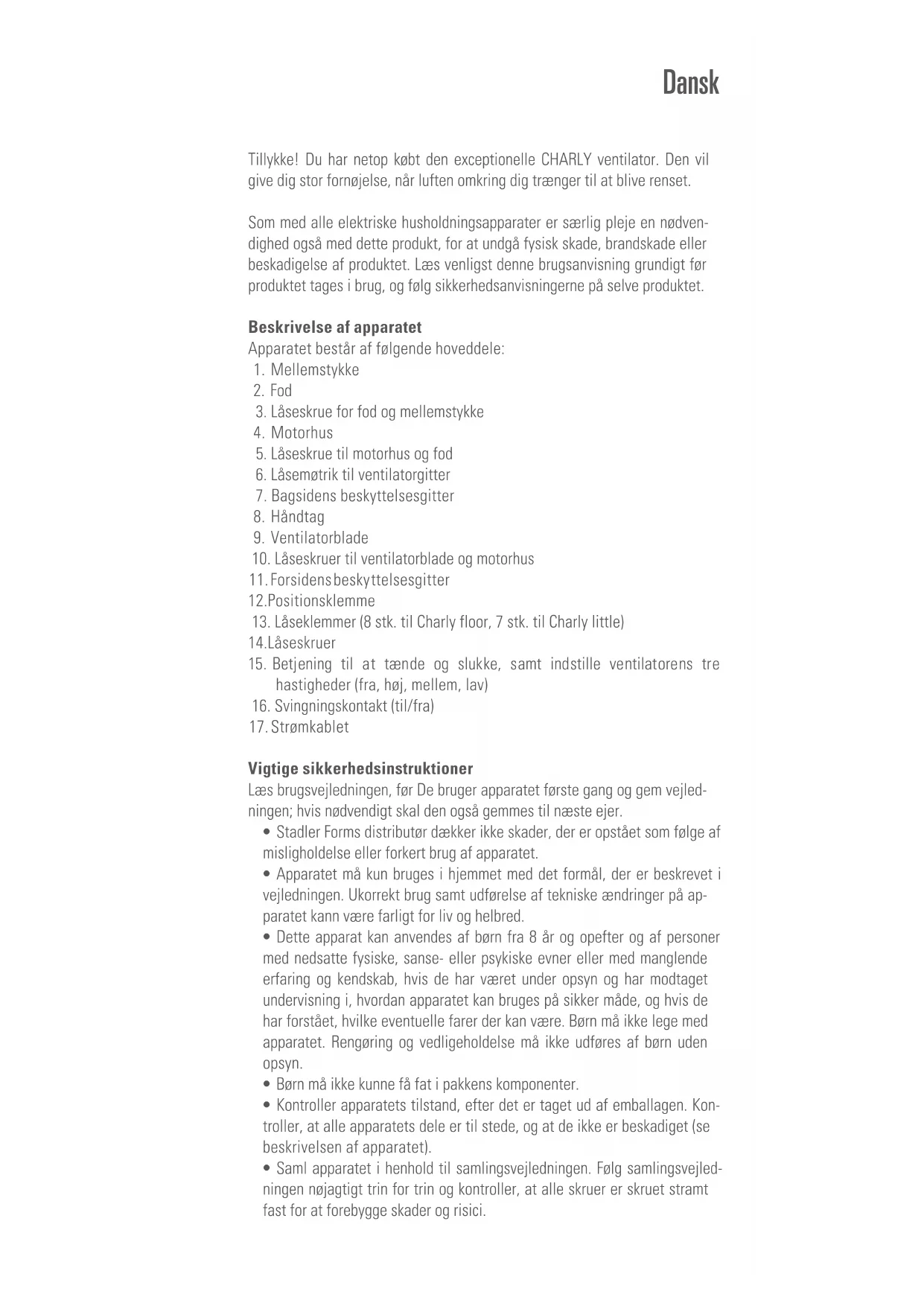- Reparationer af elektriske apparater må kun udføres af en kvalificeret, elektrisk tekniker. Samling (se side 2 og 3) OBS: Beskyttelsesgitteret skal være lukket korrekt, før apparatet tændes for at undgå skader og forebygge risici. Kontroller, at alle skruer og låsemø- trikker er strammet godt fast. Sæt først strømkablet i stikkontakten, når apparatet er helt samlet. A. Fjern låseskruen (3) på undersiden af mellemstykket (1). Sæt mellem- stykket (1) i foden (2), og fastgør med låseskruen til fod og mellemstykke (3). B. Skru låseskruen (5) på undersiden af mellemstykket (1) ud. Find motorhu- set (4) på mellemstykket (1), og fastgør med låseskruen til motorhus og fod (5). C. Fjern låsemøtrikken til gitteret (6) fra motorhuset (4), og anbring bagsi- dens beskyttelsesgitter (7) på motorhuset (4). Kontroller, at håndtaget (8) på bagsidens beskyttelsesgitter (7) sidder i toppen. Skru herefter låsemøtrikken til gitteret (6) tilbage på motorhuset (4), så bagsidens be- skyttelsesgitter (7) fastgøres i sin position. D. Sæt ventilatorbladene (9) på motorhuset (4), og fastgør deres position med låseskruen til ventilatorblade og motorhus (10) (sidder løst på venti- latorbladene). Stram skruen, og fastgør ventilatorbladene (9). E. Anbring forsidens beskyttelsesgitter (11) på bagsidens beskyttelsesgit- ter (7). Kontroller, at positionsklemmen (12) på forsidens beskyttelses- gitter sidder fast på bagsidens beskyttelsesgitter som vist på tegningenpå side 2–3. Luk de to gitre ved at fastgøre de 8 låseklemmer (13) (eller 7 på den lille Charly-model). Kontroller, at alle låseklemmer (13) sidder godt fast. F. Fastgør de to gitre (7 og 11) med låseskruen (14). Ibrugtagning / betjening