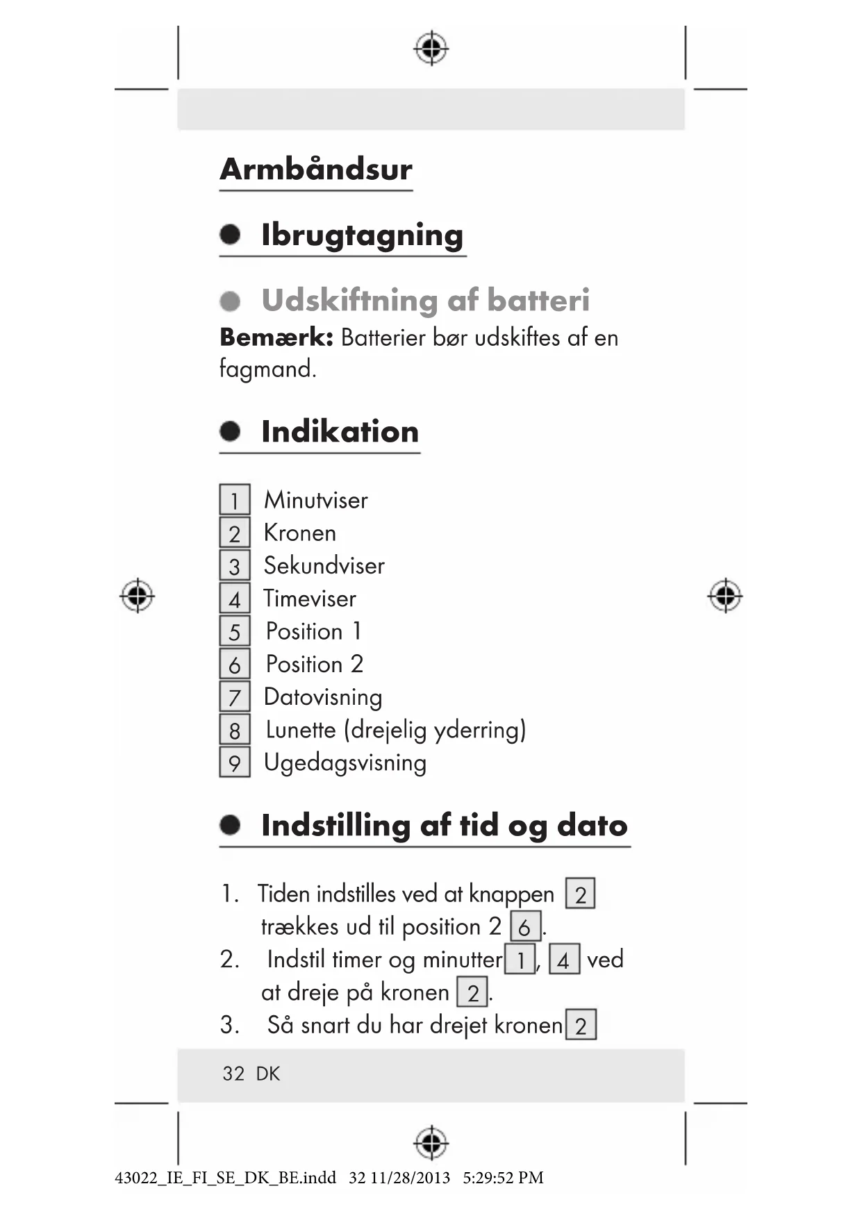 Miljøskader på grund af forkert bortskaffelse af batterier! Batterier må ikke bortskaffes med husholdningsaffald. De kan indeholde giftige tungmetaller og er underlagt behandling af miljøskadelig affald. De kemiske symboler for tungmetaller er følgende: Cd = kadmium, Hg = kviksølv, Pb = bly. Aflever derfor brugte batterier på Deres kommunale opsamlingsplads. GARANTI Apparatet er produceret omhyggeligt efter strenge kvalitetskrav og inden levering afprøvet samvittighedsfuldt. Hvis der forekommer mangler ved dette produkt, har du juridiske rettigheder over for sælgeren af dette produkt. Disse juridiske rettigheder indskrænkes ikke af vores garanti, der beskrives i det følgende. Du får 3 års garanti fra købsdatoen på dette apparat. Garantifristen begynder 43022_IE_FI_SE_DK_BE.indd 37 11/28/2013 5:29:52 PM38 DK med købsdatoen. Opbevar den originale kassebon på et sikkert sted. Denne kassebon behøves som dokumentation for købet. Hvis der inden for tre år fra købsdatoen for dette produkt opstår en materiale- eller fabrikationsfejl, bliver produktet repareret eller erstattet - efter vores valg - af os uden omkostninger for dig. Garantien bortfalder, hvis apparatet bliver beskadiget eller ikke anvendes eller vedligeholdes korrekt. Garantien gælder for materiale- eller fabrikationsfejl. Denne garanti dækker ikke produktdele, som er udsat for normalt slid og derfor kan betragtes som normale sliddele (f.eks. batterier) eller ved skader på skrøbelige dele; f.eks. kontakter, akkumulatorer som er fremstillet i glas. Formindskelsen af vandtætheden er ligeledes ikke dækket af garantien. Vandtæthedens tilstand er heller ikke nogen varig egenskab og bør derfor 43022_IE_FI_SE_DK_BE.indd 38 11/28/2013 5:29:52 PM39 DK regelmæssigt vedligeholdes. Vær venligst opmærksom på at ved åbning og reparation af Deres ur gennem personer som ikke er autoriseret hertil, så ophører Deres garantikrav. 43022_IE_FI_SE_DK_BE.indd 39 11/28/2013 5:29:52 PM40 FR/BE Montre