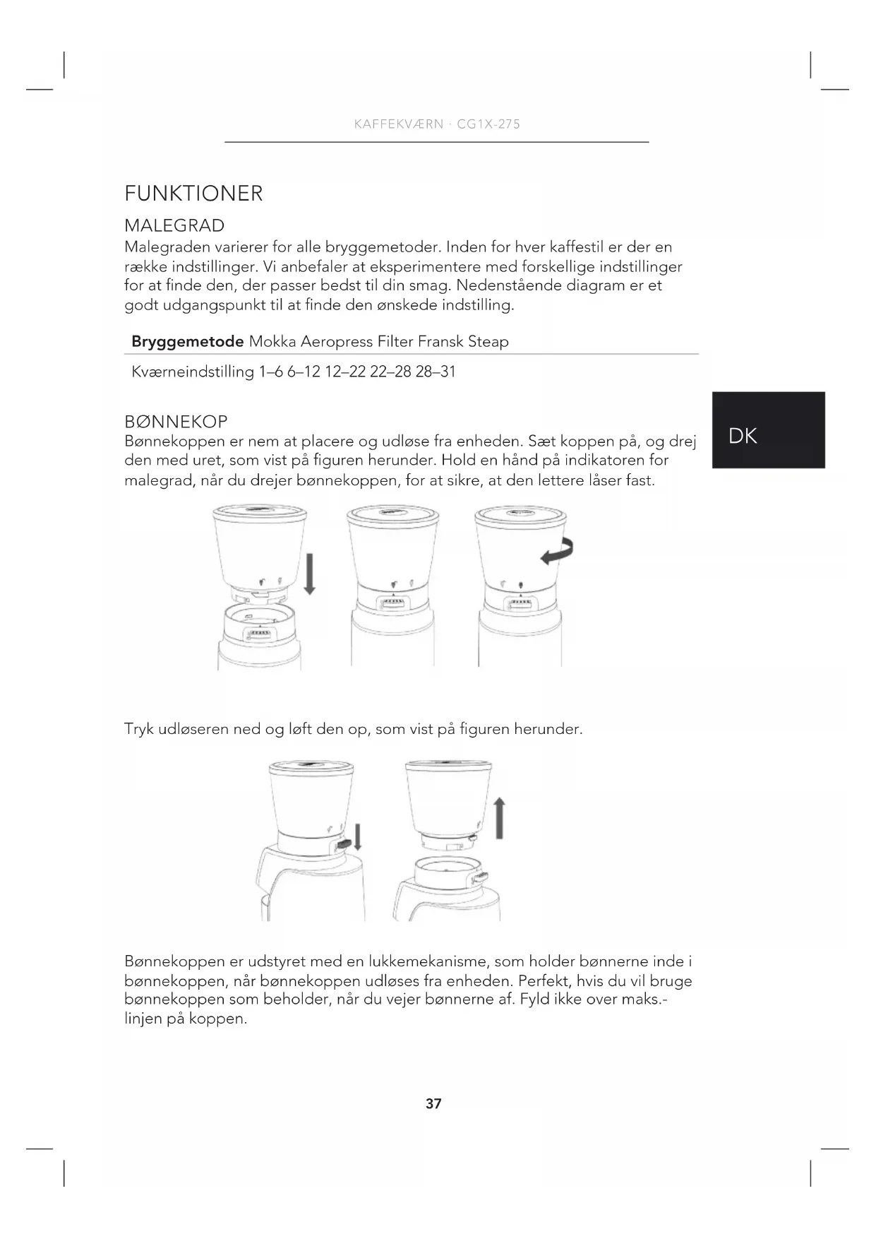 FUNKTIONER MALEGRAD Malegraden varierer for alle bryggemetoder. Inden for hver kaffestil er der en række indstillinger. Vi anbefaler at eksperimentere med forskellige indstillinger for at nde den, der passer bedst til din smag. Nedenstående diagram er et godt udgangspunkt til at nde den ønskede indstilling. BØNNEKOP Bønnekoppen er nem at placere og udløse fra enheden. Sæt koppen på, og drej den med uret, som vist på guren herunder. Hold en hånd på indikatoren for malegrad, når du drejer bønnekoppen, for at sikre, at den lettere låser fast. Tryk udløseren ned og løft den op, som vist på guren herunder. Bønnekoppen er udstyret med en lukkemekanisme, som holder bønnerne inde i bønnekoppen, når bønnekoppen udløses fra enheden. Perfekt, hvis du vil bruge bønnekoppen som beholder, når du vejer bønnerne af. Fyld ikke over maks.- linjen på koppen. Bryggemetode Mokka Aeropress Filter Fransk Steap Kværneindstilling 1–6 6–12 12–22 22–28 28–3138