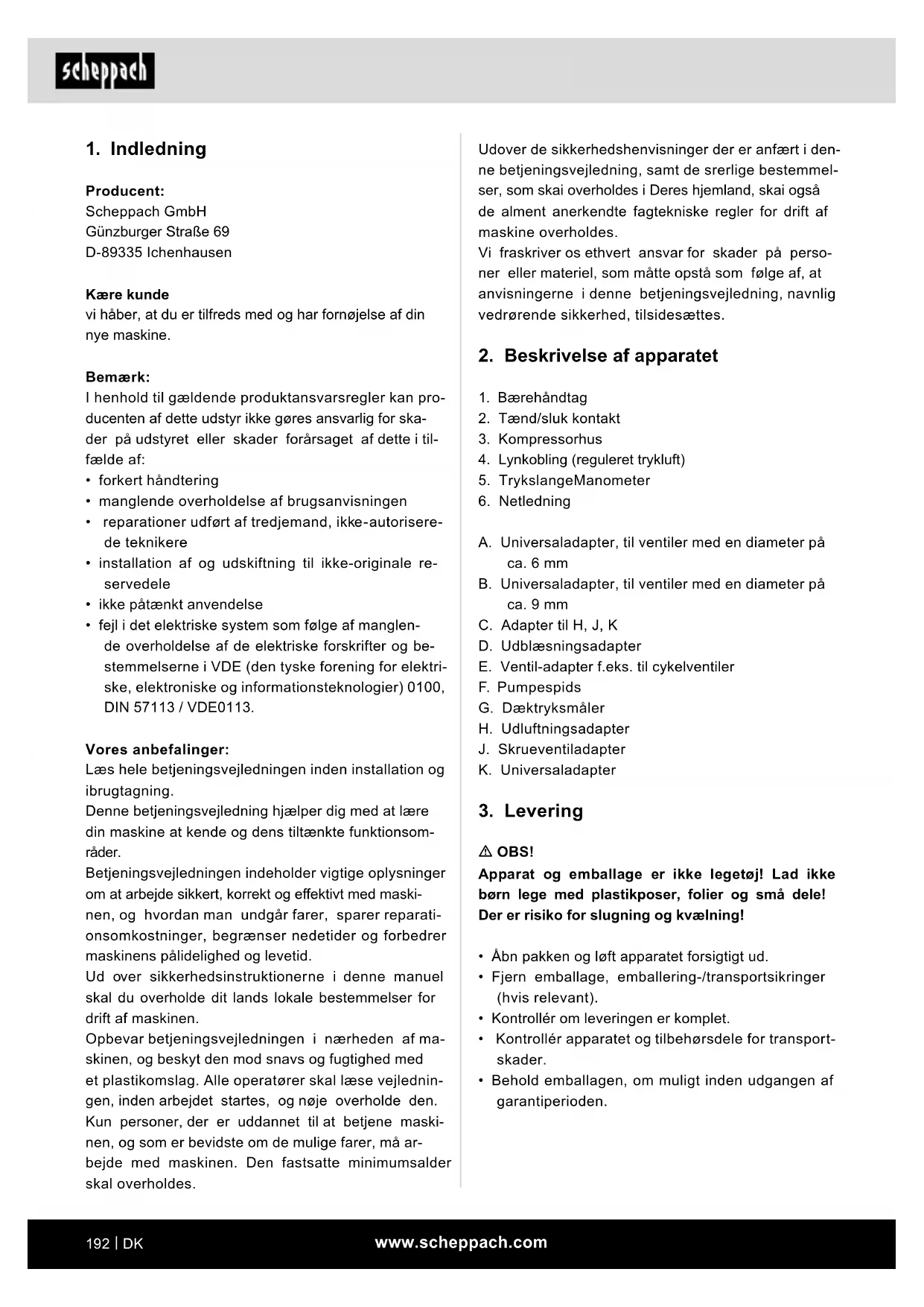 Producent: Scheppach GmbH Günzburger Straße 69 D-89335 Ichenhausen Kære kunde vi håber, at du er tilfreds med og har fornøjelse af din nye maskine. Bemærk: I henhold til gældende produktansvarsregler kan pro- ducenten af dette udstyr ikke gøres ansvarlig for ska- der på udstyret eller skader forårsaget af dette i til- fælde af: