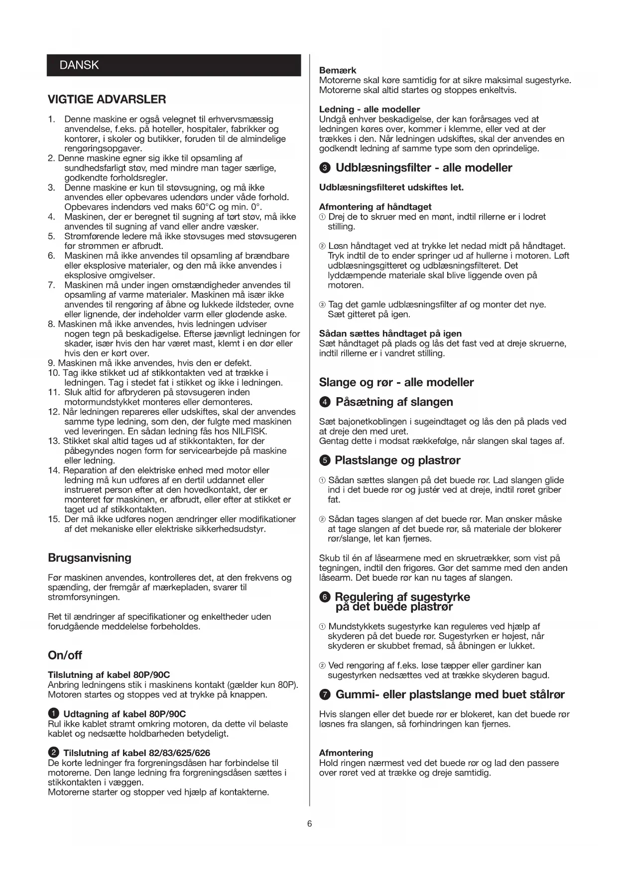 af det mekaniske eller elektriske sikkerhedsudstyr. Brugsanvisning Før maskinen anvendes, kontrolleres det, at den frekvens og spænding, der fremgår af mærkepladen, svarer til strømforsyningen. Ret til ændringer af specifikationer og enkeltheder uden forudgående meddelelse forbeholdes. On/off Tilslutning af kabel 80P/90C Anbring ledningens stik i maskinens kontakt (gælder kun 80P). Motoren startes og stoppes ved at trykke på knappen. Q Udtagning af kabel 80P/90C Rul ikke kablet stramt omkring motoren, da dette vil belaste kablet og nedsætte holdbarheden betydeligt. W Tilslutning af kabel 82/83/625/626 De korte ledninger fra forgreningsdåsen har forbindelse til motorerne. Den lange ledning fra forgreningsdåsen sættes i stikkontakten i væggen. Motorerne starter og stopper ved hjælp af kontakterne. DANSK Bemærk Motorerne skal køre samtidig for at sikre maksimal sugestyrke. Motorerne skal altid startes og stoppes enkeltvis. Ledning - alle modeller Undgå enhver beskadigelse, der kan forårsages ved at ledningen køres over, kommer i klemme, eller ved at der trækkes i den. Når ledningen udskiftes, skal der anvendes en godkendt ledning af samme type som den oprindelige. E Udblæsningsfilter - alle modeller Udblæsningsfilteret udskiftes let. Afmontering af håndtaget ! Drej de to skruer med en mønt, indtil rillerne er i lodret stilling. @ Løsn håndtaget ved at trykke let nedad midt på håndtaget. Tryk indtil de to ender springer ud af hullerne i motoren. Løft udblæsningsgitteret og udblæsningsfilteret. Det lyddæmpende materiale skal blive liggende oven på motoren. # Tag det gamle udblæsningsfilter af og monter det nye. Sæt gitteret på igen. Sådan sættes håndtaget på igen Sæt håndtaget på plads og lås det fast ved at dreje skruerne, indtil rillerne er i vandret stilling. Slange og rør - alle modeller R Påsætning af slangen Sæt bajonetkoblingen i sugeindtaget og lås den på plads ved at dreje den med uret. Gentag dette i modsat rækkefølge, når slangen skal tages af. T Plastslange og plastrør ! Sådan sættes slangen på det buede rør. Lad slangen glide ind i det buede rør og justér ved at dreje, indtil røret griber fat. @ Sådan tages slangen af det buede rør. Man ønsker måske at tage slangen af det buede rør, så materiale der blokerer rør/slange, let kan fjernes. Skub til én af låsearmene med en skruetrækker, som vist på tegningen, indtil den frigøres. Gør det samme med den anden låsearm. Det buede rør kan nu tages af slangen. Y Regulering af sugestyrke på det buede plastrør ! Mundstykkets sugestyrke kan reguleres ved hjælp af skyderen på det buede rør. Sugestyrken er højest, når skyderen er skubbet fremad, så åbningen er lukket. @ Ved rengøring af f.eks. løse tæpper eller gardiner kan sugestyrken nedsættes ved at trække skyderen bagud. U Gummi- eller plastslange med buet stålrør Hvis slangen eller det buede rør er blokeret, kan det buede rør løsnes fra slangen, så forhindringen kan fjernes. Afmontering Hold ringen nærmest ved det buede rør og lad den passere over røret ved at trække og dreje samtidig.7 Montering Gummikoblingen letter arbejdet og forlænger slangens levetid. (Hvis koblingen bliver stram, skal den afmonteres, hvorefter der strøs godt med spansk kridt eller talkum indvendig i den). ! Anbring gummikoblingen på en jævn flade og pres den ene ring over kanten, indtil den passer med rillen i gummimuffen. @ Skub det buede rør gennem samlingen og træk det så langt igennem, som det er muligt. # Tag fat i det buede rør med venstre hånd tæt mod gummimuffen og skub slangens kugleskål så langt ind som muligt. $ Drej eller skub den anden ring på plads i gummikoblingens rille. % Træk i de retninger, som pilene angiver, og slangen er samlet. I Samling af Ø50mm rør - 82/83/625/626 ! Før rør og mundstykke samles, skrues låseringen af ved at dreje mod urets retning. @ Derefter samles rør og mundstykke, og låseringen skrues på ved at dreje med uret, indtil den tager fat. Tilbehør NILFISK leverer et stort udvalg af rør og mundstykker til almindelige rengøringsopgaver, rengøring over hovedhøjde og specielle rengøringsopgaver. Se vores tilbehørsfoldere. O Rystning af filter - kun 80P Støvsugeren kan også anvendes uden støvposen. I så fald samles støvet i beholderens nederste del, der så tømmes efter behov. For at bevare sugestyrken på et konstant niveau, skal filteret holdes så rent som muligt, hvilket gøres ved at ryste det med regelmæssige mellemrum, eller ved at støvsuge det. Filteret må ikke vaskes eller børstes. Afmontering og udskiftning af motoren - 80P ! Tag fat i motorhåndtaget og åbn de øverste hængsler. Løft motoren af. @ Træk filteret ud ved hjælp af den blå bundplade og ryst det let fra side til side. Slangen skal forblive på beholderen, medens filteret rystes. Når motoren monteres igen, skal kontakten sidde lige over beholderens indsugningssted og stikket vende bagud. Sådan af- og genmonteres motoren - 90C ! Afmonter motoren ved at dreje håndtaget mod uret. Løft motoren af. Filteret kan kun rengøres ved støvsugning. @ Sæt motoren på igen, så on/off kontakten er på linie med den on/off kontakt, der er trykt på den øverste beholder. Drej motoren med uret, indtil der høres et tydeligt klik. Hvis motoren ikke vil låse på plads når den drejes, trykkes den røde låsearm inde i beholderen i pilens retning. Tømning af beholderen - 80P/90C Når filteret er renset og slangen taget af, løsnes de to hængsler og beholderen åbnes. Løft overdelen af og tøm beholderens nederste del. Rystning 82/83 For at holde en konstant sugestyrke skal filteret være så rent som muligt. Filteret skal derfor rystes jævnligt. Det kan rystes nogle gange, før det er nødvendigt at tømme beholderen. Sluk for motoren. Ryst filteret flere gange ved hjælp af rystestangen. Slangen skal være fastgjort til beholderen under rystningen. Filteret må ikke vaskes el