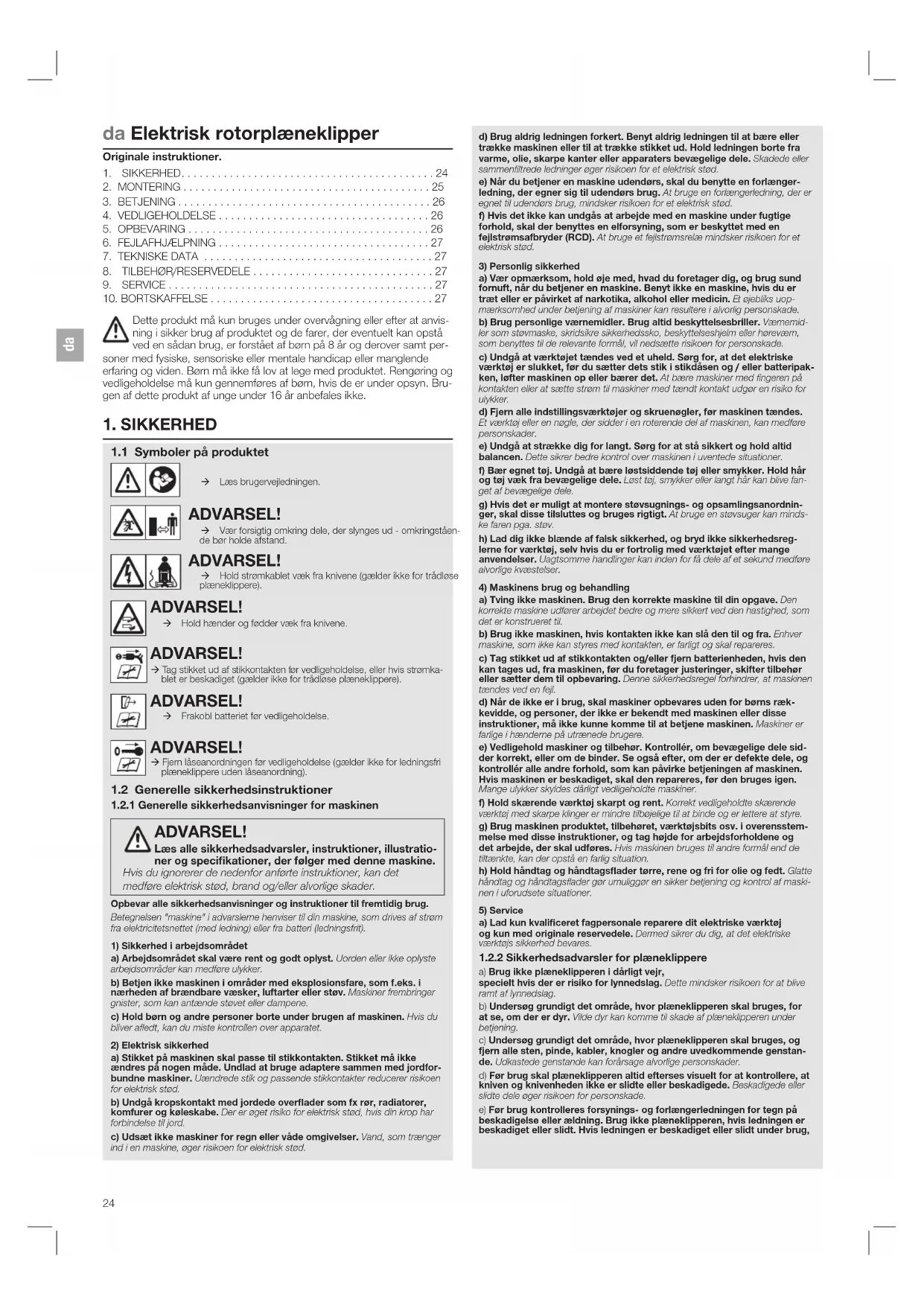 csda Elektrisk rotorplæneklipper Originale instruktioner. Dette produkt må kun bruges under overvågning eller efter at anvis- ning i sikker brug af produktet og de farer, der eventuelt kan opstå ved en sådan brug, er forstået af børn på 8 år og derover samt per- soner med fysiske, sensoriske eller mentale handicap eller manglende erfaring og viden. Børn må ikke få lov at lege med produktet. Rengøring og vedligeholdelse må kun gennemføres af børn, hvis de er under opsyn. Bru- gen af dette produkt af unge under 16 år anbefales ikke.