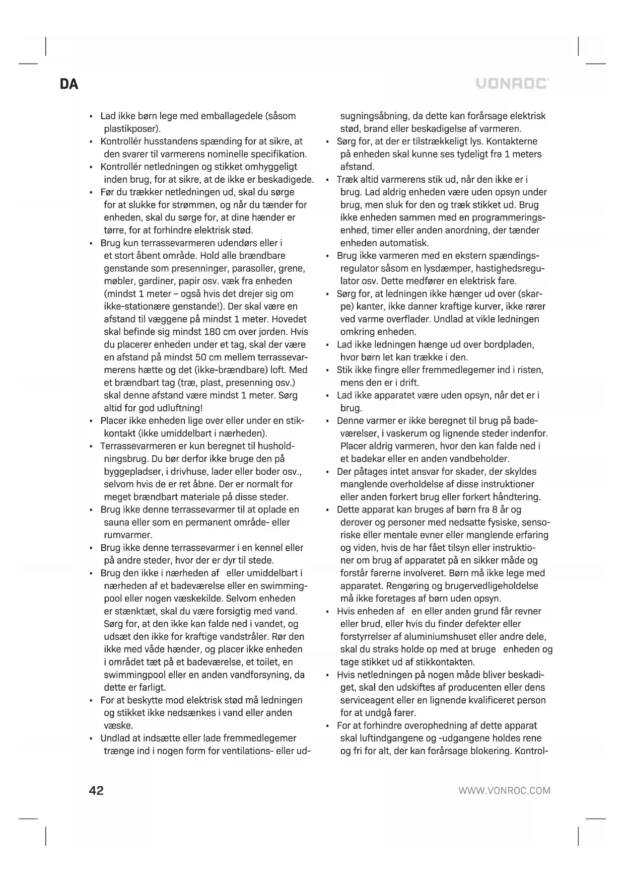 Tænd/sluk (fig. A, B) Varmeren kan kun tændes og slukkes ved hjælp af fjernbetjeningen (8). Inden brug skal tænd/ sluk-kontakten (5) på varmeren først tændes. Uden en fjernbetjening kan varmeren ikke betjenes. Hvis du ikke er i besiddelse af fjernbetjeningen, bedes du kontakte Vonroc-kundeservice.