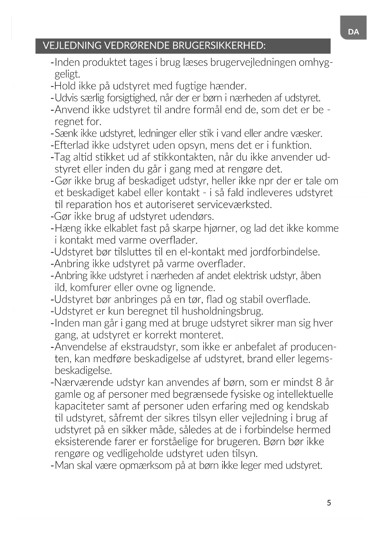 Anvendelse af ekstraudstyr, som ikke er anbefalet af producen- ten, kan medføre beskadigelse af udstyret, brand eller legems- beskadigelse. - Nærværende udstyr kan anvendes af børn, som er mindst 8 år gamle og af personer med begrænsede fysiske og intellektuelle kapaciteter samt af personer uden erfaring med og kendskab l udstyret, såfremt der sikres lsyn eller vejledning i brug af udstyret på en sikker måde, således at de i forbindelse hermed eksisterende farer er forståelige for brugeren. Børn bør ikke rengøre og vedligeholde udstyret uden lsyn.