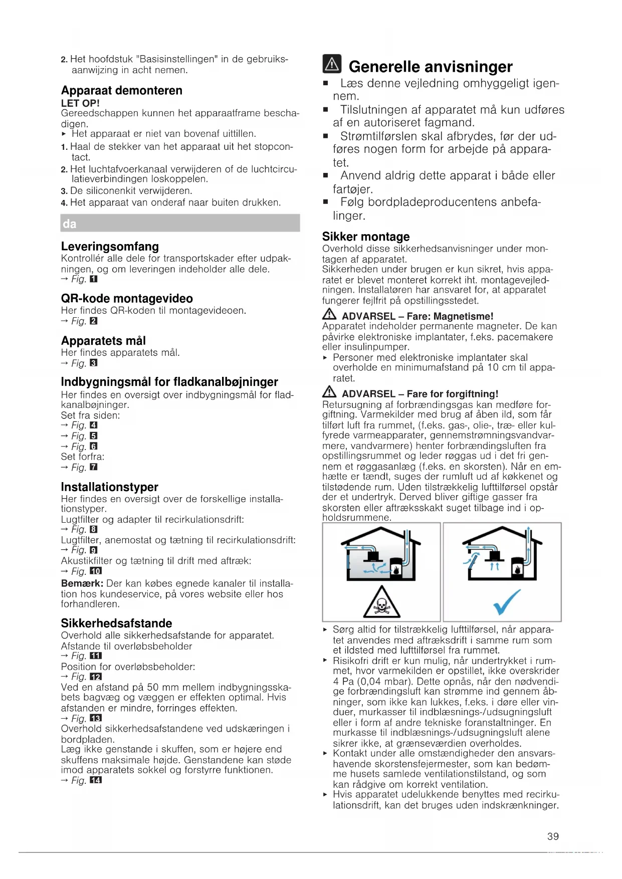 Sørg altid for tilstrækkelig lufttilførsel, når appara- tet anvendes med aftræksdrift i samme rum som et ildsted med lufttilførsel fra rummet.