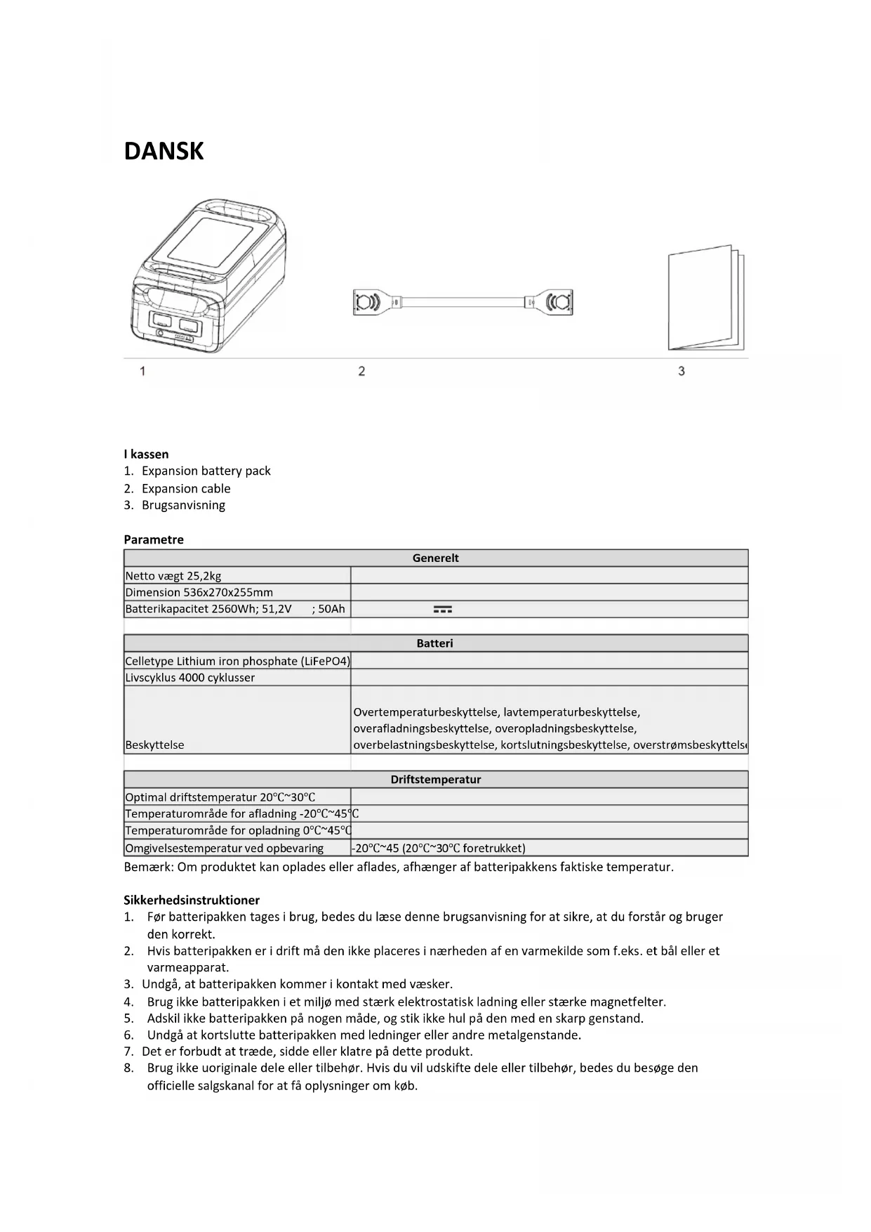 officielle salgskanal for at få oplysninger om køb. Netto vægt 25,2kg Dimension 536x270x255mm Batterikapacitet 2560Wh; 51,2V ; 50Ah Celletype Lithium iron phosphate (LiFePO4) Livscyklus 4000 cyklusser Beskyttelse Overtemperaturbeskyttelse, lavtemperaturbeskyttelse, overafladningsbeskyttelse, overopladningsbeskyttelse, overbelastningsbeskyttelse, kortslutningsbeskyttelse, overstrømsbeskyttelse Optimal driftstemperatur 20℃~30℃ Temperaturområde for afladning -20℃~45℃ Temperaturområde for opladning 0℃~45℃ Omgivelsestemperatur ved opbevaring -20℃~45 (20℃~30℃ foretrukket) Generelt Batteri Driftstemperatur9. Når du bruger batteripakken, skal du nøje overholde den driftstemperatur, der er angivet i denne brugsanvisning. Hvis temperaturen er for høj, kan batteriet bryde i brand eller endda eksplodere. Hvis temperaturen er for lav, vil batteripakkens effektivitet blive alvorligt påvirket, og normal brug kan blive forringet.