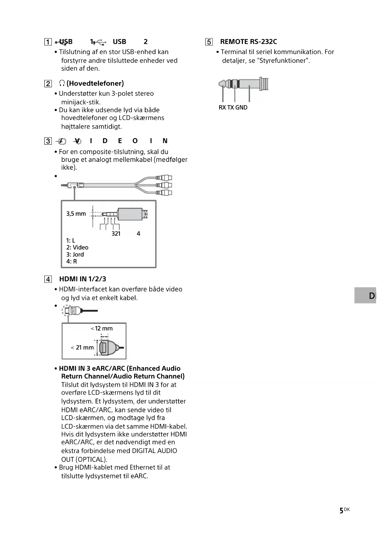 - HDMI IN 3 eARC/ARC (Enhanced Audio Return Channel/Audio Return Channel) Tilslut dit lydsystem til HDMI IN 3 for at overføre LCD-skærmens lyd til dit lydsystem. Et lydsystem, der understøtter HDMI eARC/ARC, kan sende video til LCD-skærmen, og modtage lyd fra LCD-skærmen via det samme HDMI-kabel. Hvis dit lydsystem ikke understøtter HDMI eARC/ARC, er det nødvendigt med en ekstra forbindelse med DIGITAL AUDIO OUT (OPTICAL).