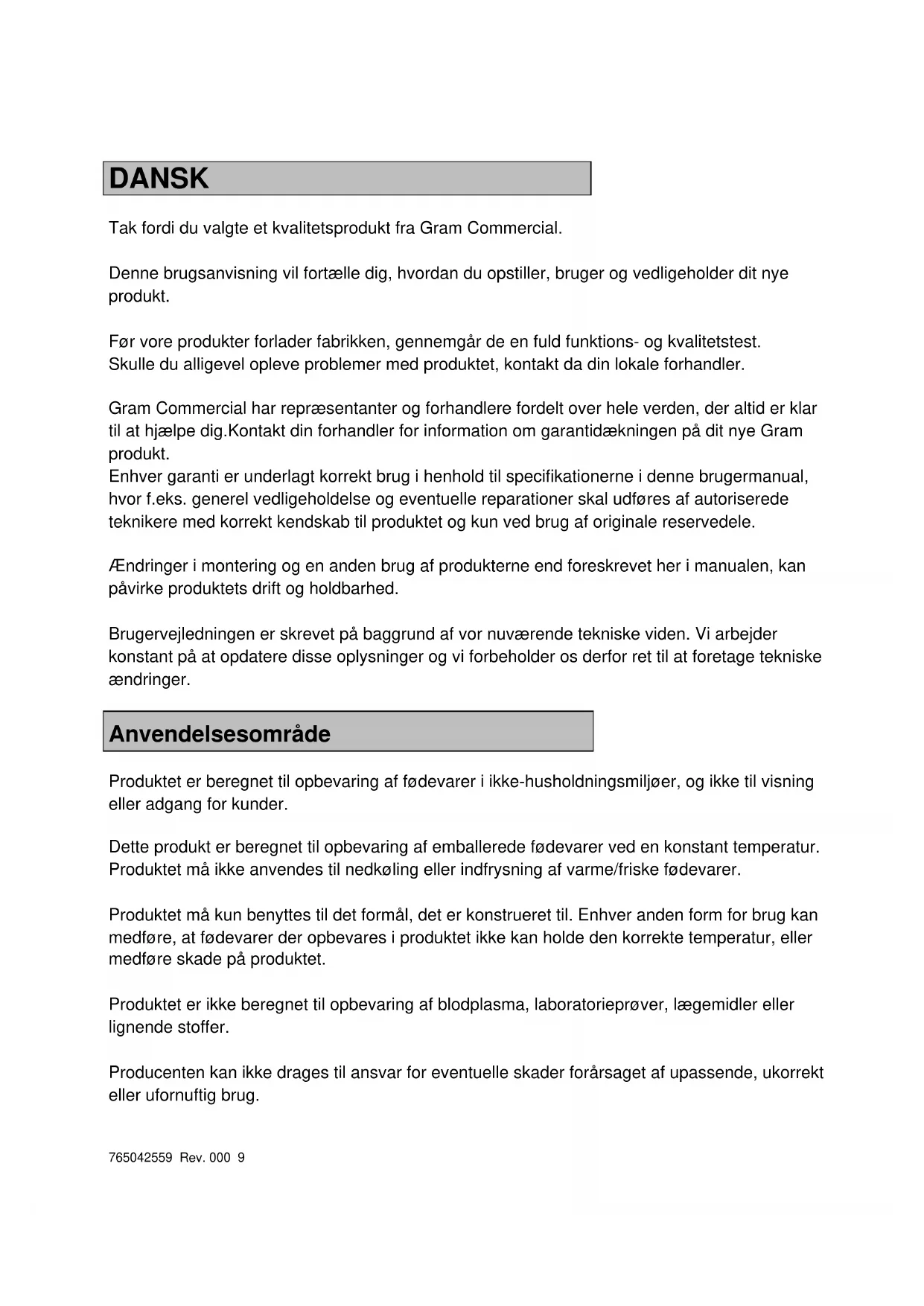 Tak fordi du valgte et kvalitetsprodukt fra Gram Commercial. Denne brugsanvisning vil fortælle dig, hvordan du opstiller, bruger og vedligeholder dit nye produkt. Før vore produkter forlader fabrikken, gennemgår de en fuld funktions- og kvalitetstest. Skulle du alligevel opleve problemer med produktet, kontakt da din lokale forhandler. Gram Commercial har repræsentanter og forhandlere fordelt over hele verden, der altid er klar til at hjælpe dig.Kontakt din forhandler for information om garantidækningen på dit nye Gram produkt. Enhver garanti er underlagt korrekt brug i henhold til specifikationerne i denne brugermanual, hvor f.eks. generel vedligeholdelse og eventuelle reparationer skal udføres af autoriserede teknikere med korrekt kendskab til produktet og kun ved brug af originale reservedele. Ændringer i montering og en anden brug af produkterne end foreskrevet her i manualen, kan påvirke produktets drift og holdbarhed. Brugervejledningen er skrevet på baggrund af vor nuværende tekniske viden. Vi arbejder konstant på at opdatere disse oplysninger og vi forbeholder os derfor ret til at foretage tekniske ændringer. Anvendelsesområde