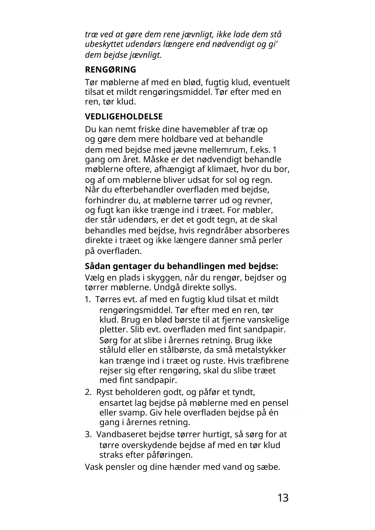 OMHYGGELIGT. Produktet er testet til brug i private hjem. Disse havemøbler er forbehandlet med vandbaseret træbejdse, så overaden kan holde til udendørs brug. Du forlænger bedst levetiden på dine havemøbler af13 træ ved at gøre dem rene jævnligt, ikke lade dem stå ubeskyttet udendørs længere end nødvendigt og gi' dem bejdse jævnligt. RENGØRING Tør møblerne af med en blød, fugtig klud, eventuelt tilsat et mildt rengøringsmiddel. Tør efter med en ren, tør klud. VEDLIGEHOLDELSE Du kan nemt friske dine havemøbler af træ op og gøre dem mere holdbare ved at behandle dem med bejdse med jævne mellemrum, f.eks. 1 gang om året. Måske er det nødvendigt behandle møblerne oftere, afhængigt af klimaet, hvor du bor, og af om møblerne bliver udsat for sol og regn. Når du efterbehandler overaden med bejdse, forhindrer du, at møblerne tørrer ud og revner, og fugt kan ikke trænge ind i træet. For møbler, der står udendørs, er det et godt tegn, at de skal behandles med bejdse, hvis regndråber absorberes direkte i træet og ikke længere danner små perler på overaden. Sådan gentager du behandlingen med bejdse: Vælg en plads i skyggen, når du rengør, bejdser og tørrer møblerne. Undgå direkte sollys.