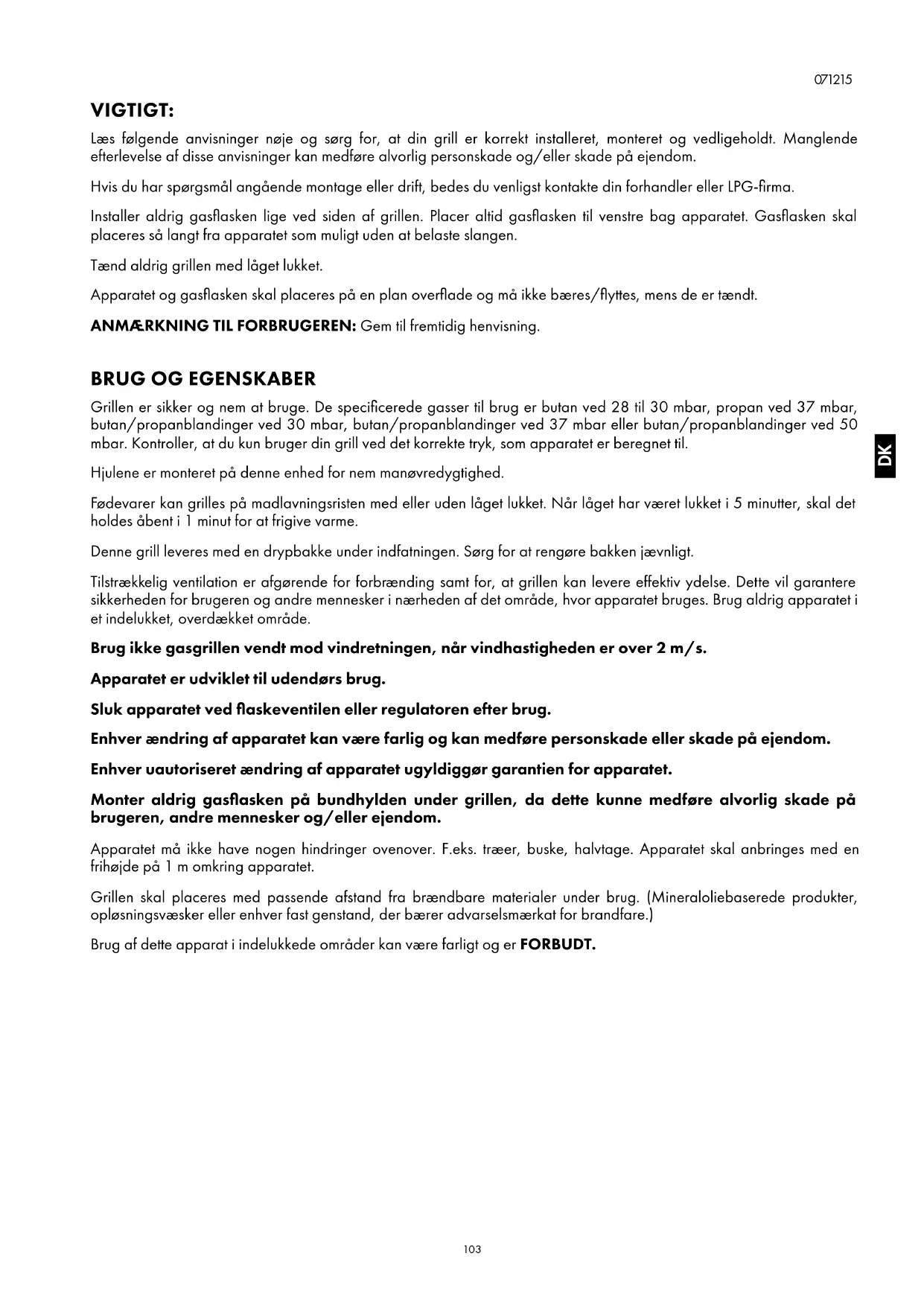 VIGTIGT: Læs følgende anvisninger nøje og sørg for, at din grill er korrekt installeret, monteret og vedligeholdt. Manglende efterlevelse af disse anvisninger kan medføre alvorlig personskade og/eller skade på ejendom. Hvis du har spørgsmål angående montage eller drift, bedes du venligst kontakte din forhandler eller LPG-firma. Installer aldrig gasflasken lige ved siden af grillen. Placer altid gasflasken til venstre bag apparatet. Gasflasken skal placeres så langt fra apparatet som muligt uden at belaste slangen. Tænd aldrig grillen med låget lukket. Apparatet og gasflasken skal placeres på en plan overflade og må ikke bæres/flyttes, mens de er tændt. ANMÆRKNING TIL FORBRUGEREN: Gem til fremtidig henvisning.