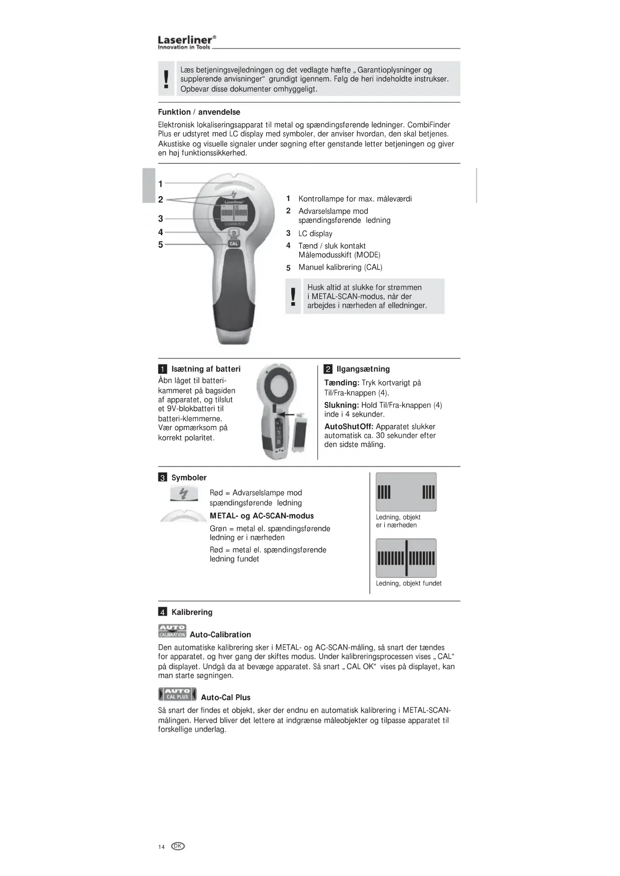 Funktion / anvendelse Auto-Calibration Den automatiske kalibrering sker i METAL- og AC-SCAN-måling, så snart der tændes for apparatet, og hver gang der skiftes modus. Under kalibreringsprocessen vises „CAL“ på displayet. Undgå da at bevæge apparatet. Så snart „CAL OK“ vises på displayet, kan man starte søgningen. Auto-Cal Plus Så snart der findes et objekt, sker der endnu en automatisk kalibrering i METAL-SCAN- målingen. Herved bliver det lettere at indgrænse måleobjekter og tilpasse apparatet til forskellige underlag. Manual_CombiFinder-Plus_Rev.1212.indd 14 08.01.13 11:34CombiFinder Plus