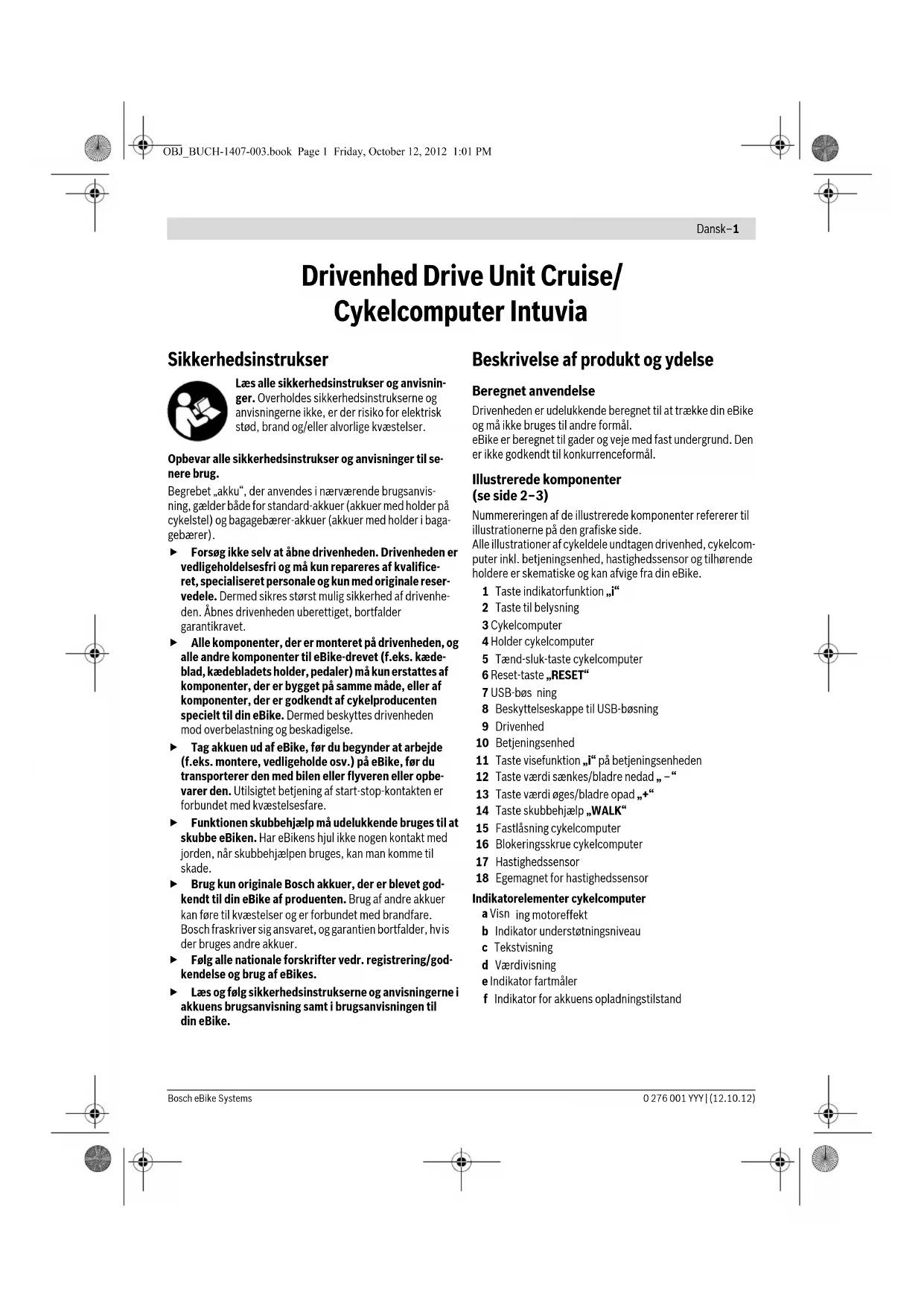 der bruges andre akkuer. Følg alle nationale forskrifter vedr. registrering/god- kendelse og brug af eBikes. Læs og følg sikkerhedsinstrukserne og anvisningerne i akkuens brugsanvisning samt i brugsanvisningen til din eBike. Beskrivelse af produkt og ydelse Beregnet anvendelse Drivenheden er udelukkende beregnet til at trække din eBike og må ikke bruges til andre formål. eBike er beregnet til gader og veje med fast undergrund. Den er ikke godkendt til konkurrenceformål. Illustrerede komponenter (se side 2–3) Nummereringen af de illustrerede komponenter refererer til illustrationerne på den grafiske side. Alle illustrationer af cykeldele undtagen drivenhed, cykelcom- puter inkl. betjeningsenhed, hastighedssensor og tilhørende holdere er skematiske og kan afvige fra din eBike. 1 Taste indikatorfunktion „i“ 2 Taste til belysning 3 Cykelcomputer 4 Holder cykelcomputer 5 Tænd-sluk-taste cykelcomputer 6 Reset-taste „RESET“ 7 USB-bøs ning 8 Beskyttelseskappe til USB-bøsning 9 Drivenhed 10 Betjeningsenhed 11 Taste visefunktion „i“ på betjeningsenheden 12 Taste værdi sænkes/bladre nedad „ –“ 13 Taste værdi øges/bladre opad „+“ 14 Taste skubbehjælp „WALK“ 15 Fastlåsning cykelcomputer 16 Blokeringsskrue cykelcomputer 17 Hastighedssensor 18 Egemagnet for hastighedssensor Indikatorelementer cykelcomputer a Visn ing motoreffekt b Indikator understøtningsniveau c Tekstvisning d Værdivisning e Indikator fartmåler f Indikator for akkuens opladningstilstand OBJ_BUCH-1407-003.book Page 1 Friday, October 12, 2012 1:01 PMDansk–2 0 276 001 YYY | (12.10.12) Bosch eBike Systems Tekniske data Montering Isætning og udtagning af akkuen Læs og følg akkuens brugsanvisning mht. hvordan akkuen sættes i og tages ud af eBike. Isætning og udtagning af cykelcomputeren (se Fig. A) Cykelcomputeren 3 sættes i ved at skubbe den ind i holderen forfra 4. Cykelcomputeren 3 tages af ved at trykke på låsen 15 og skubbe den ud af holderen fremad 4. Fjern altid cykelcomputeren, før eBike stilles fra et sted, så drevet ikke kan bruges af uberettiget tredje- mand. eBike-systemet kan ikke tændes uden cykelcompu- ter. Det er også muligt at sikre cykelcomputeren i holderen, så den ikke kan tages ud. Demonter hertil holderen 4 fra styret. An- brin g cykelcomputeren i holderen. Skru blokeringsskruen 16 nedefra ind i gevindet på holderen. Monter holderen på styret igen. Kontrol af hastighedssensoren (se Fig. B) Hastighedssensoren 17 og den tilhørende egemagnet 18 skal være monteret på en sådan måde, at egemagneten bevæger sig forbi hastighedssensoren i en afstand på mindst 5 mm og maks. 17 mm, når hjulet drejer en omdrejning. Bemærk: Er afstanden mellem hastighedssensor 17 og ege- magnet 18 for lille eller for stor, eller er hastighedssensoren 17 ikke tilsluttet rigtigt, fungerer fartmålerindikatoren ikke e, og eBike-dre vet arbejder i nødkørselsprogrammet. Løsn i dette tilfælde skruen i egemagneten 18 fastgør ege- magneten på egen på en sådan måde, at den løber forbi ha- stighedssensorens markering i den rigtige afstand. Fremkom- mer der heller ikke herefter nogen hastighed i fartmålerindikatoren e, bedes du kontakte en autoriseret cy- kelforhandler. Brug Ibrugtagning Forudsætninger eBike-systemet kan kun aktiveres, hvis følgende forudsætnin- ger er opfyldt: –En tilstrækkeligt opladt akku er sat i (se akkuens brugsan- visning). – Cykelcomputeren er sat rigtigt ind i holderen (se „Isætning og udtagning af cykelcomputeren“, side Dansk–2). –Hastighedssensoren er tilsluttet rigtigt (se „Kontrol af ha- stighedssensoren“, side Dansk–2). eBike-system tændes/slukkes eBike-systemet tændes på følgende måder: –Er cykelcomputeren allerede tæ ndt, når den sættes ind i holderen, tændes eBike-systemet automatisk. – Tryk kort en gang på tænd-sluk-tasten 5 på cykelcompute- ren, når cykelcomputeren og akkuen er sat i. –Tryk på akkuens tænd-sluk-tasten, når cykelcomputeren er sat i (se akkuens brugsanvisning). Bemærk: Pedalerne på eBike må ikke være belastet, når eBike-systemet tændes, da motoreffekten ellers begrænses. I tekstvisningen c fremkommer fejlmeldin gen „Release pe- dal“ (aflast pedal). Er eBike-systemet ved et tilfælde blevet tændt med belastede pedaler, skal du slukke for det og så tænde for det igen uden belastning. Drevet aktiveres, så snart du træder i pedalerne (undtagen i funktionen skubbehjælp, se „Skubbehjælp tændes/slukkes“, side Dansk–4). Motoreffekten retter sig efter indstillingerne på cykelcomputeren. Drivenhed Drive Unit Cruise Typenummer 0 275 007 006/