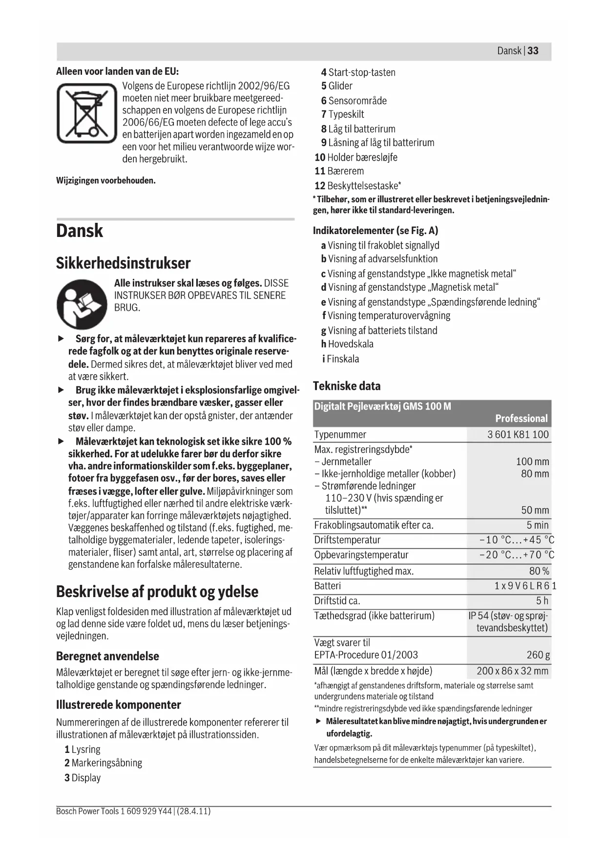 - Tilbehør, som er illustreret eller beskrevet i betjeningsvejlednin- gen, hører ikke til standard-leveringen. Indikatorelementer (se Fig. A) a Visning til frakoblet signallyd b Visning af advarselsfunktion c Visning af genstandstype „Ikke magnetisk metal“ d Visning af genstandstype „Magnetisk metal“ e Visning af genstandstype „Spændingsførende ledning“ f Visning temperaturovervågning g Visning af batteriets tilstand h Hovedskala i Finskala Tekniske data Digitalt Pejleværktøj GMS 100 M Professional Typenummer 3 601 K81 100 Max. registreringsdybde* – Jernmetaller – Ikke-jernholdige metaller (kobber) – Strømførende ledninger 110–230 V (hvis spænding er tilsluttet)** 100 mm 80 mm 50 mm Frakoblingsautomatik efter ca. 5min Driftstemperatur –10 °C...+45 °C Opbevaringstemperatur –20 °C...+70 °C Relativ luftfugtighed max. 80 % Batteri 1x9V6LR61 Driftstid ca.