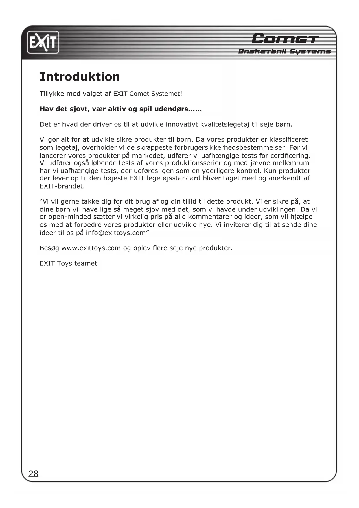 - Alle EXIT Comet basketball systemer, inklusiv dem der bruges til udstilling, skal samles og fyldes med sand, som instrueret. hvis du ikke overholder disse instruktioner, kan du risike ALVORLIG SKADE.