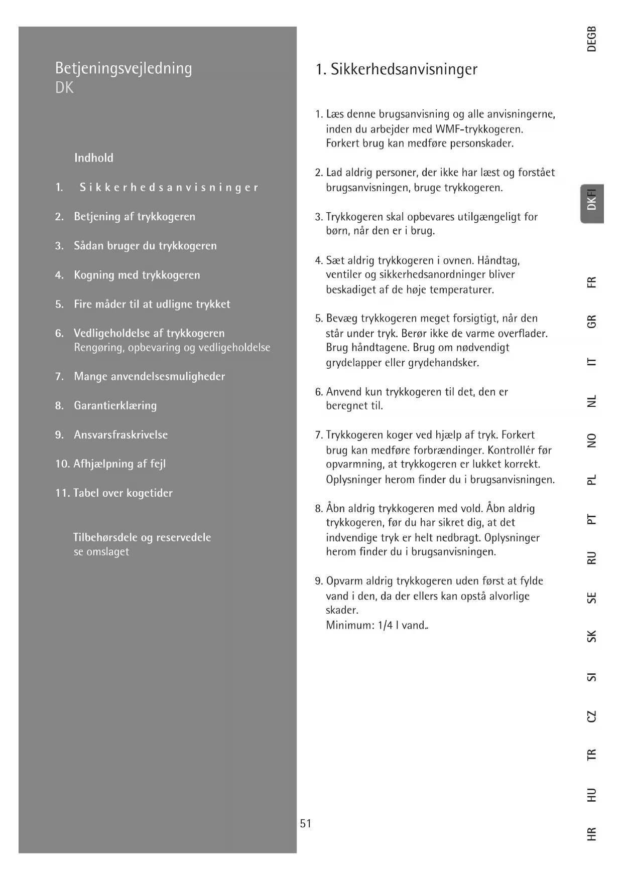 I garantiperioden garanteres det, at produktet og alle dele fungerer fejlfrit. Garantiperioden er 3 år og begynder på købsdatoen. Købet skal dokumenteres med et garantibevis, som er komplet udfyldt af forhandleren. Hvis der i garantiperioden forekommer mangler ved produktet, afhjælper vi disse uden beregning ved at udskifte de mangelfulde dele med fejlfrie dele. Defekte dele kan kun udskiftes af WMF- specialforretninger eller serviceafdelingen hos WMF AG i Geislingen/ Steige, Tyskland. Garantikravet omfatter kun sådanne krav. Yderligere krav i henhold til garantien udelukkes. For at kunne gøre et garantikrav gældende skal der fremlægges et garantibevis. Dette skal udleveres til køberen sammen med WMF-trykkogeren. Garantikravet har kun gyldighed ved fremlæggelse af et komplet udfyldt garantibevis. Denne garantierklæring begrænser naturligvis ikke de garantirettigheder, du måtte have i henhold til gældende love. I garantiperioden råder du over følgende lovbestemte garantirettigheder inden for lovens rammer: afhjælpning af mangler, prisreduktion, hævelse af købet og skadeserstatning. Garantien omfatter ikke: – kogesignaltætningen – tætningen i resttryksikringen – tætningen i afdampningsåbningen – sikkerhedsventilen - tætningsringen – batterier Disse dele er udsat for et naturligt slid. 10 års leverandørgaranti på reservedele.58