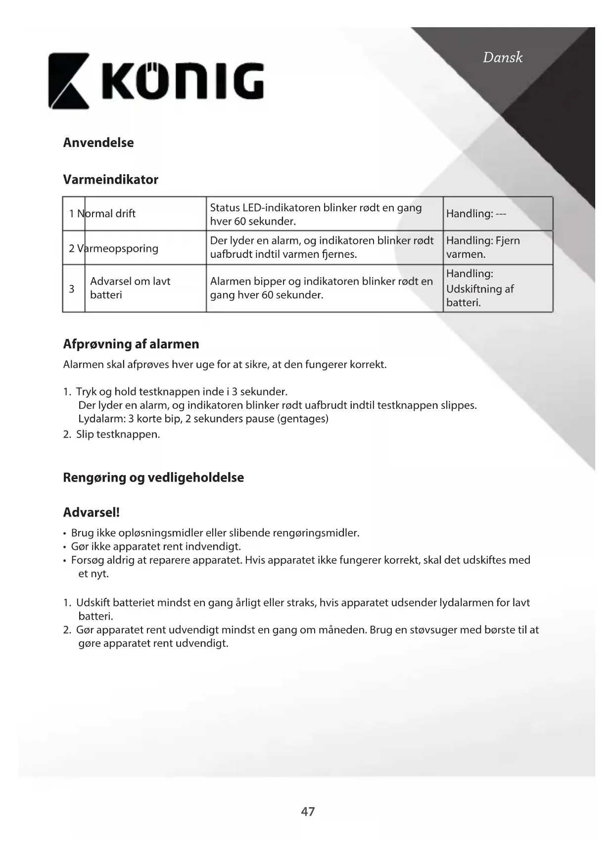 - Mal ikke over apparatet. Areal Ja Nej Stue X Spisestue X Køkken X Badeværelse/toilet X Soveværelse X Korridor X Loftsrum X Kælder X Garage X Fyrrum X46 Dansk min.10 cm min.10 cm max. 30 cm 122 cm 90 cm 90 cm 5 mm47 Dansk Anvendelse Varmeindikator 1 Normal drift Status LED-indikatoren blinker rødt en gang hver 60 sekunder. Handling: --- 2 Varmeopsporing Der lyder en alarm, og indikatoren blinker rødt uafbrudt indtil varmen ernes. Handling: Fjern varmen.