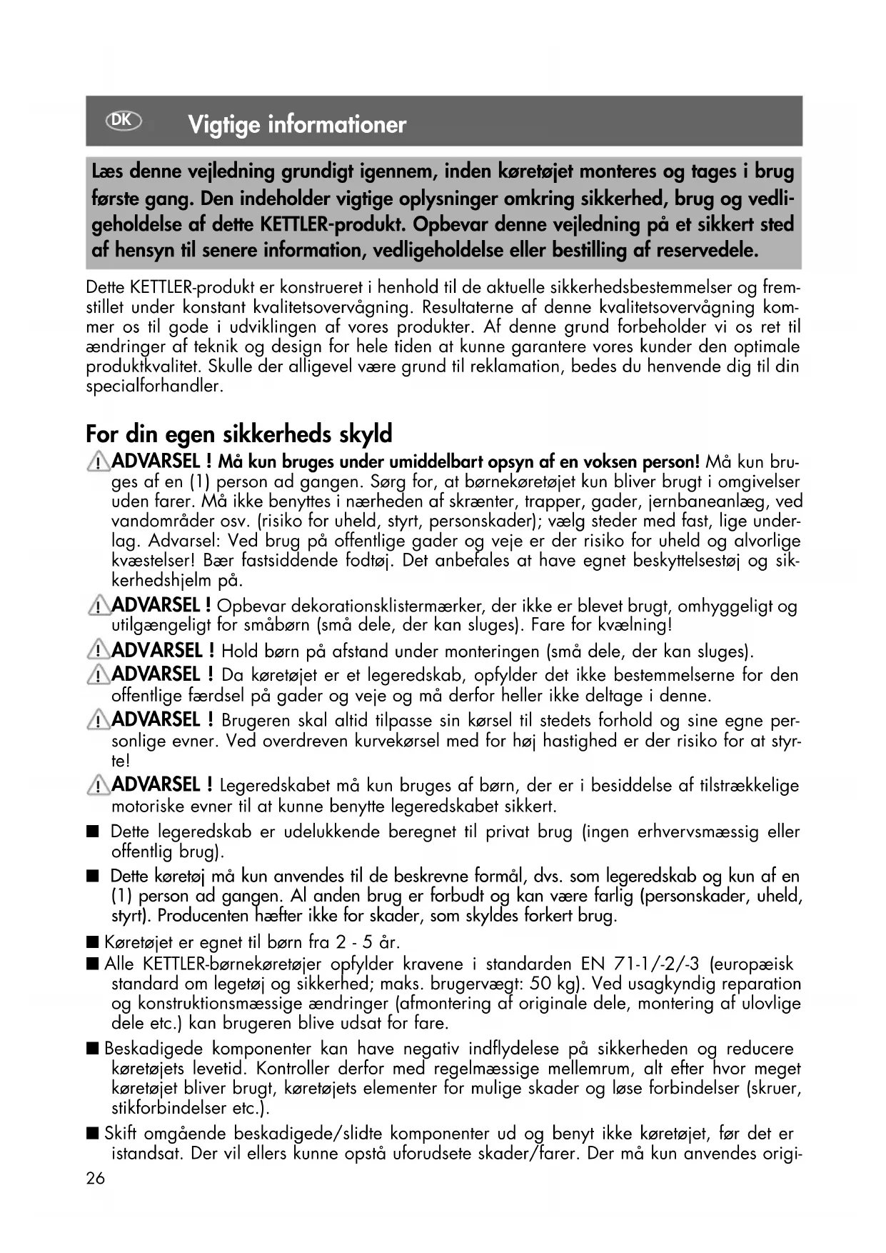 P26 Vigtige informationer Dette KETTLER-produkt er konstrueret i henhold til de aktuelle sikkerhedsbestemmelser og frem- stillet under konstant kvalitetsovervågning. Resultaterne af denne kvalitetsovervågning kom- mer os til gode i udviklingen af vores produkter. Af denne grund forbeholder vi os ret til ændringer af teknik og design for hele tiden at kunne garantere vores kunder den optimale produktkvalitet. Skulle der alligevel være grund til reklamation, bedes du henvende dig til din specialforhandler. For din egen sikkerheds skyld ADVARSEL ! Må kun bruges under umiddelbart opsyn af en voksen person! Må kun bru- ges af en (1) person ad gangen. Sørg for, at børnekøretøjet kun bliver brugt i omgivelser uden farer. Må ikke benyttes i nærheden af skrænter, trapper, gader, jernbaneanlæg, ved vandområder osv. (risiko for uheld, styrt, personskader); vælg steder med fast, lige under- lag. Advarsel: Ved brug på offentlige gader og veje er der risiko for uheld og alvorlige kvæstelser! Bær fastsiddende fodtøj. Det anbefales at have egnet beskyttelsestøj og sik- kerhedshjelm på. ADVARSEL ! Opbevar dekorationsklistermærker, der ikke er blevet brugt, omhyggeligt og utilgængeligt for småbørn (små dele, der kan sluges). Fare for kvælning! ADVARSEL ! Hold børn på afstand under monteringen (små dele, der kan sluges). ADVARSEL ! Da køretøjet er et legeredskab, opfylder det ikke bestemmelserne for den offentlige færdsel på gader og veje og må derfor heller ikke deltage i denne. ADVARSEL ! Brugeren skal altid tilpasse sin kørsel til stedets forhold og sine egne per- sonlige evner. Ved overdreven kurvekørsel med for høj hastighed er der risiko for at styr- te! ADVARSEL ! Legeredskabet må kun bruges af børn, der er i besiddelse af tilstrækkelige motoriske evner til at kunne benytte legeredskabet sikkert. ■ Dette legeredskab er udelukkende beregnet til privat brug (ingen erhvervsmæssig eller offentlig brug). ■ Dette køretøj må kun anvendes til de beskrevne formål, dvs. som legeredskab og kun af en (1) person ad gangen. Al anden brug er forbudt og kan være farlig (personskader, uheld, styrt). Producenten hæfter ikke for skader, som skyldes forkert brug. ■ Køretøjet er egnet til børn fra 2 - 5 år. ■ Alle KETTLER-børnekøretøjer opfylder kravene i standarden EN 71-1/-2/-3 (europæisk standard om legetøj og sikkerhed; maks. brugervægt: 50 kg). Ved usagkyndig reparation og konstruktionsmæssige ændringer (afmontering af originale dele, montering af ulovlige dele etc.) kan brugeren blive udsat for fare. ■ Beskadigede komponenter kan have negativ indflydelese på sikkerheden og reducere køretøjets levetid. Kontroller derfor med regelmæssige mellemrum, alt efter hvor meget køretøjet bliver brugt, køretøjets elementer for mulige skader og løse forbindelser (skruer, stikforbindelser etc.). ■ Skift omgående beskadigede/slidte komponenter ud og benyt ikke køretøjet, før det er istandsat. Der vil ellers kunne opstå uforudsete skader/farer. Der må kun anvendes origi- Læs denne vejledning grundigt igennem, inden køretøjet monteres og tages i brug første gang. Den indeholder vigtige oplysninger omkring sikkerhed, brug og vedli- geholdelse af dette KETTLER-produkt. Opbevar denne vejledning på et sikkert sted af hensyn til senere information, vedligeholdelse eller bestilling af reservedele.