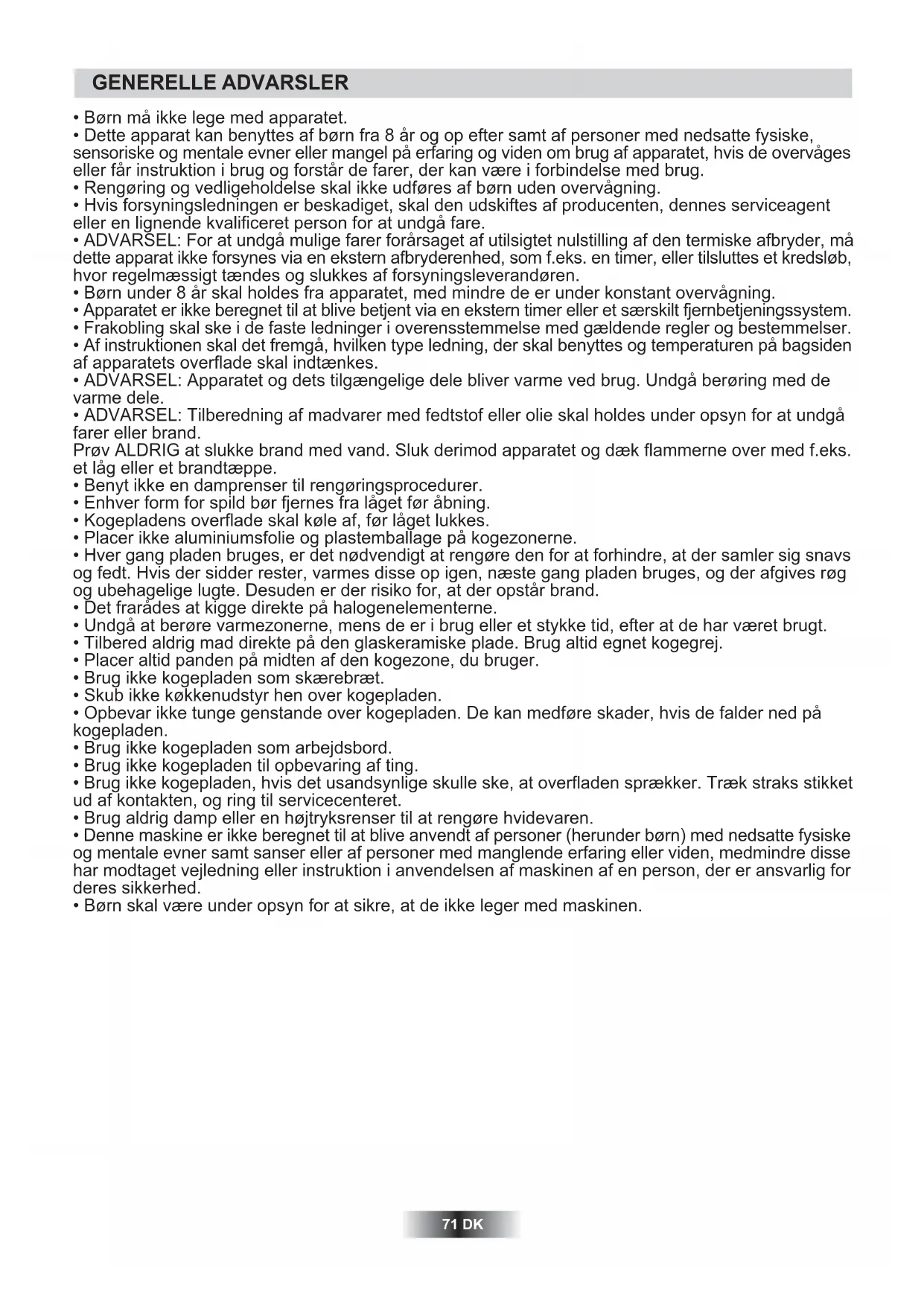 - ADVARSEL: Tilberedning af madvarer med fedtstof eller olie skal holdes under opsyn for at undgå farer eller brand. Prøv ALDRIG at slukke brand med vand. Sluk derimod apparatet og dæk flammerne over med f.eks. et låg eller et brandtæppe.