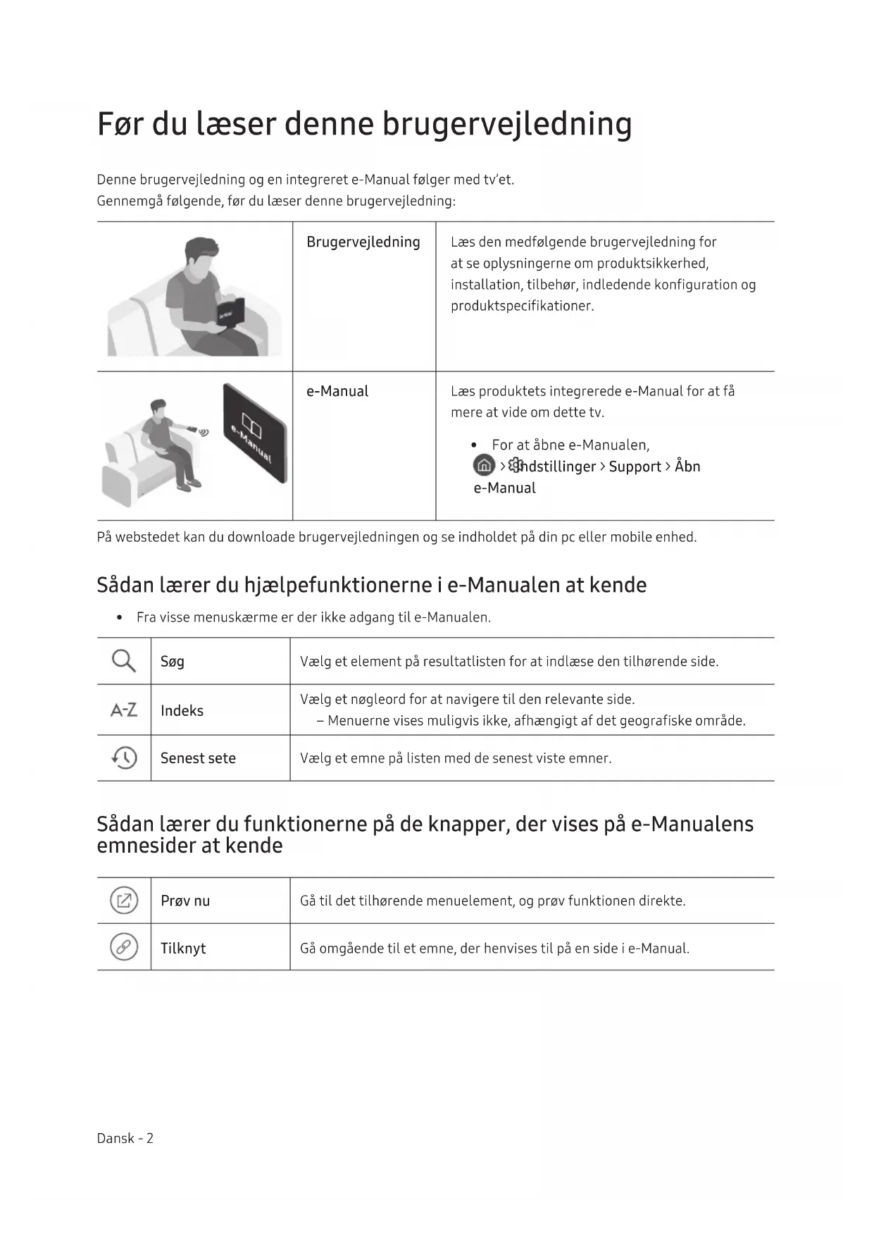 - For at åbne e-Manualen, > Indstillinger > Support > Åbn e-Manual På webstedet kan du downloade brugervejledningen og se indholdet på din pc eller mobile enhed. Sådan lærer du hjælpefunktionerne i e-Manualen at kende
