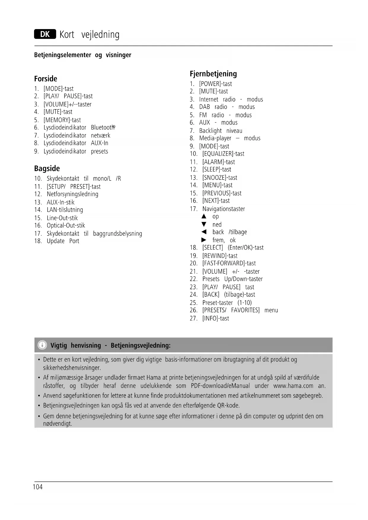 - Af miljømæssige årsager undlader rmaet Hama at printe betjeningsvejledningen for at undgå spild af værdifulde råstoffer, og tilbyder heraf denne udelukkende som PDF-download/eManual under www.hama.com an.